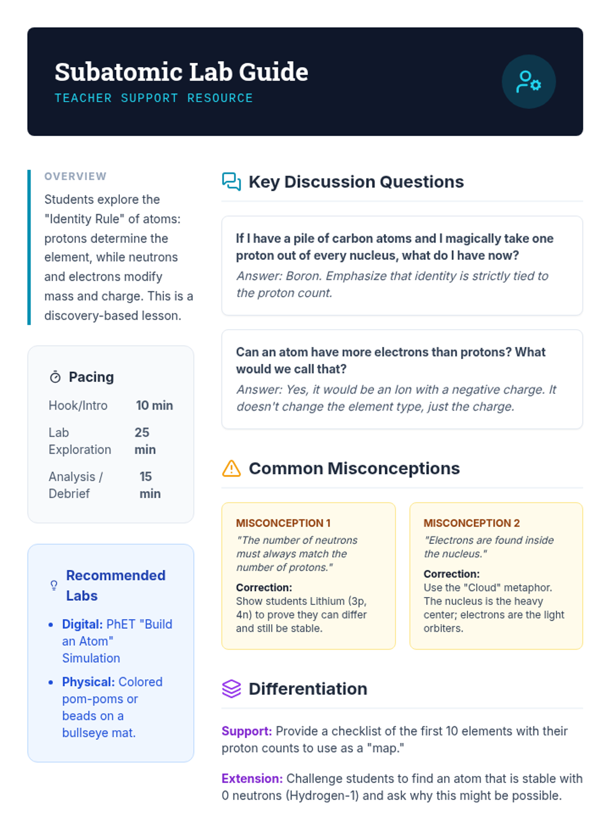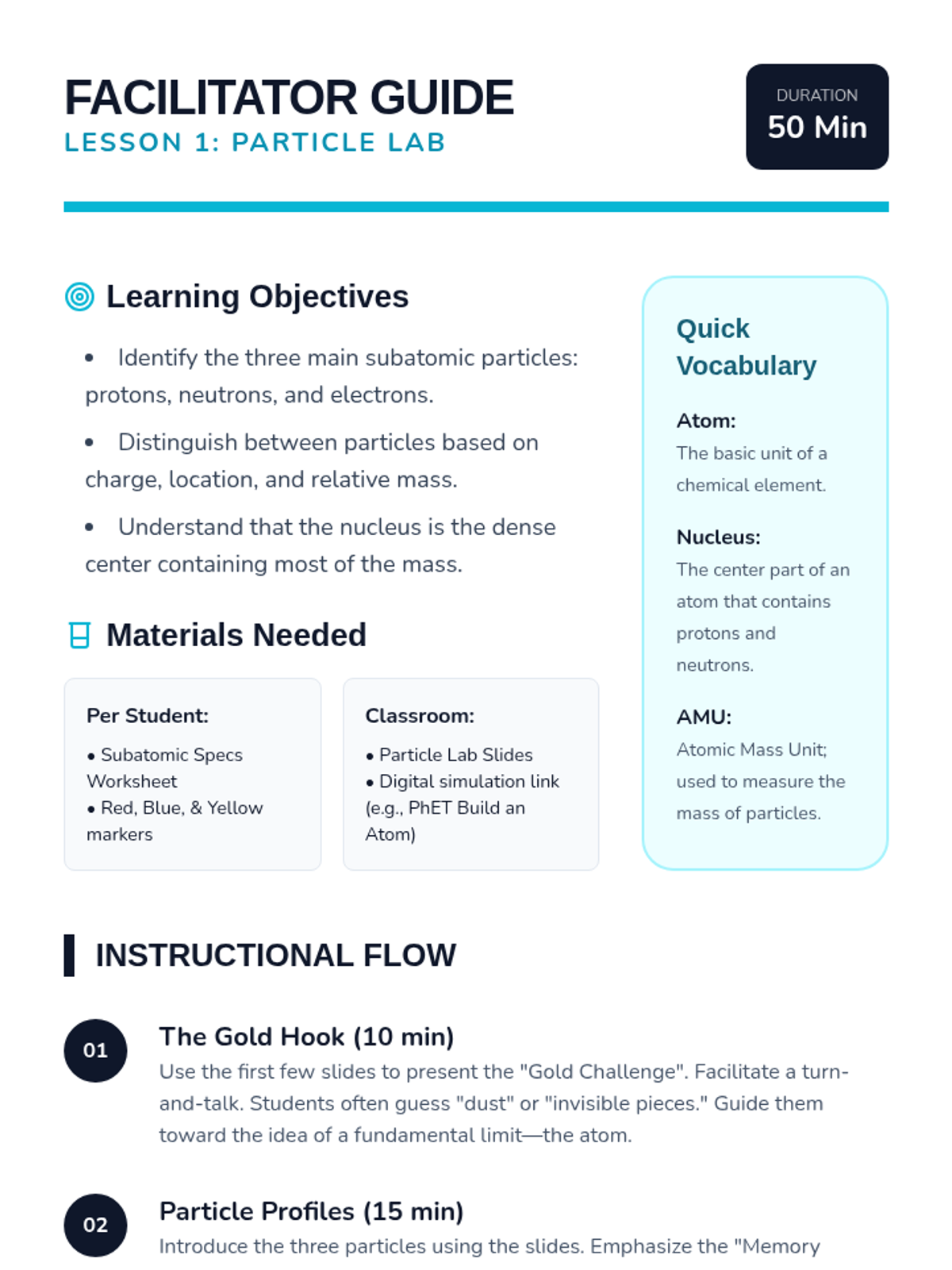 This sequence introduces 6th-grade students to atomic structure, focusing on subatomic particles, atomic number, isotopes, and electron shells. Students progress from identifying fundamental particles to constructing complex Bohr models for the first eighteen elements of the periodic table.