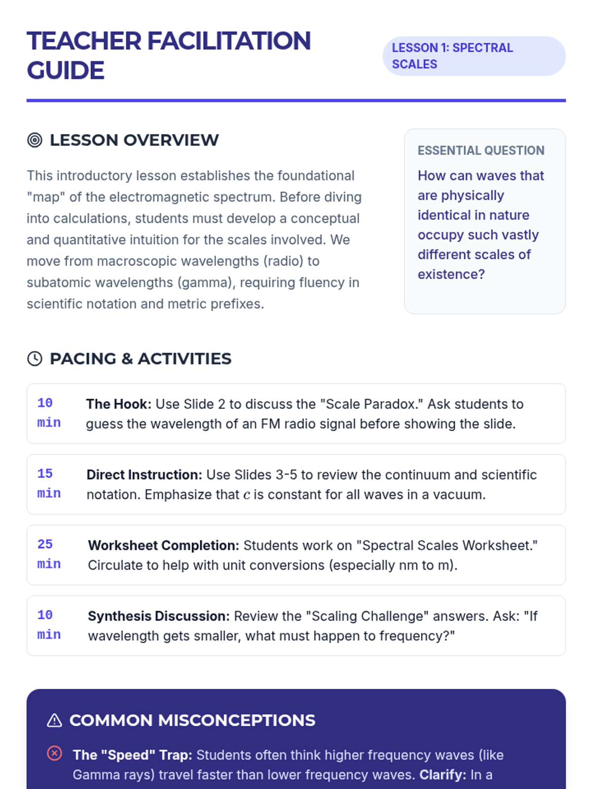 This sequence guides 8th-grade students through the physical and mathematical properties of electromagnetic waves, moving from basic wave types to complex calculations and the full scale of the electromagnetic spectrum. Students explore the inverse relationship between frequency and wavelength through inquiry-based labs and synthesis projects.
