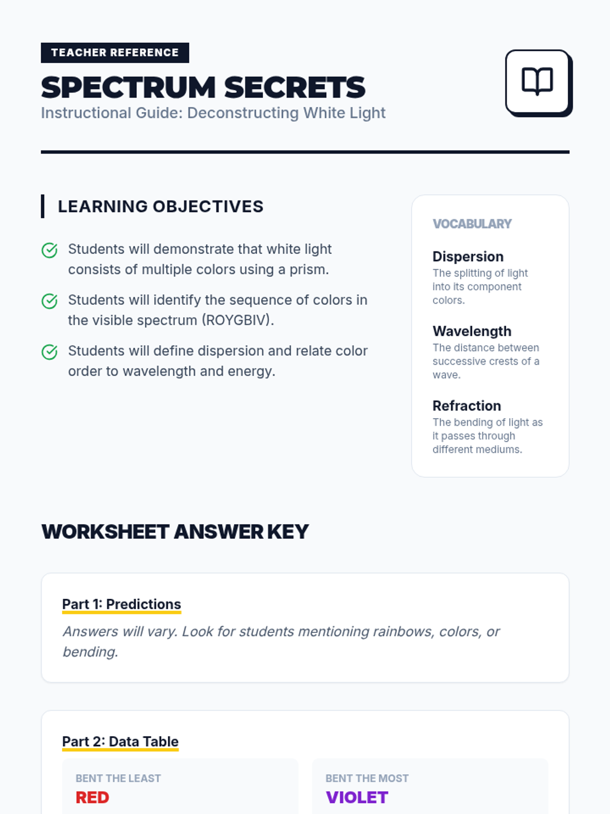 A comprehensive 6th-grade physics sequence exploring the nature of visible light, how it splits into the spectrum, interacts with surfaces through reflection and absorption, and behaves when passing through different mediums.