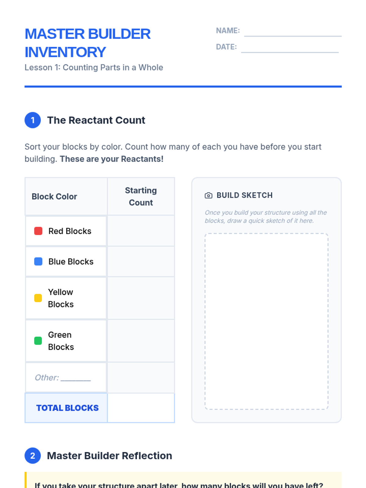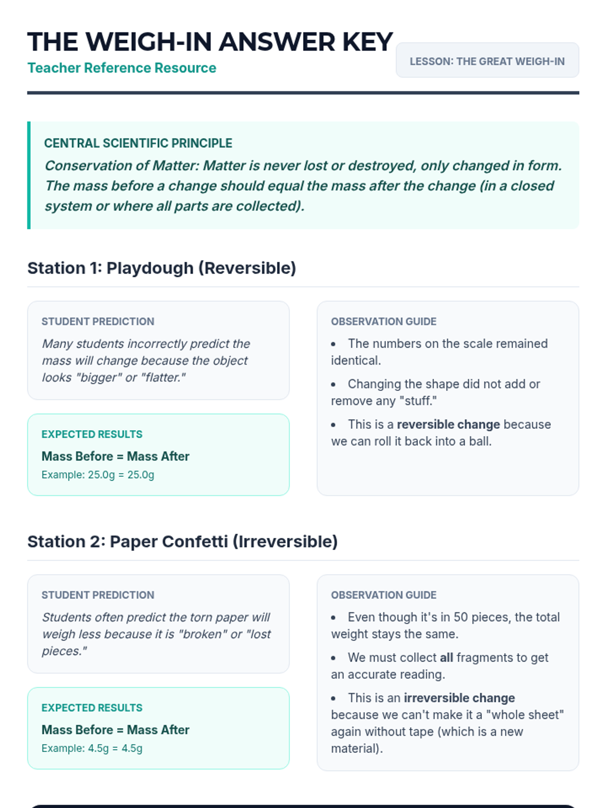 A sequence for 3rd grade students to explore the Law of Conservation of Mass using building blocks as models. Students move from counting parts to understanding that matter is neither created nor destroyed, even when rearranged.