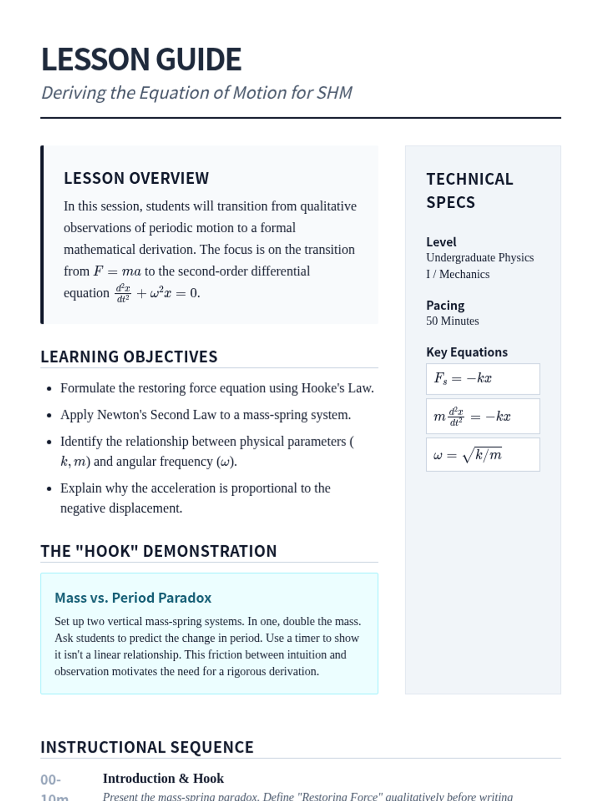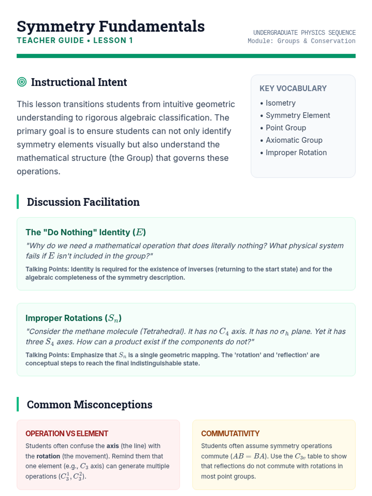 This sequence bridges the gap between abstract geometry and physical law by introducing group theory as a tool for analyzing physical systems. Students classify shapes, translate operations into matrix algebra, derive conservation laws via Noether's Theorem, and apply symmetry to quantum selection rules.