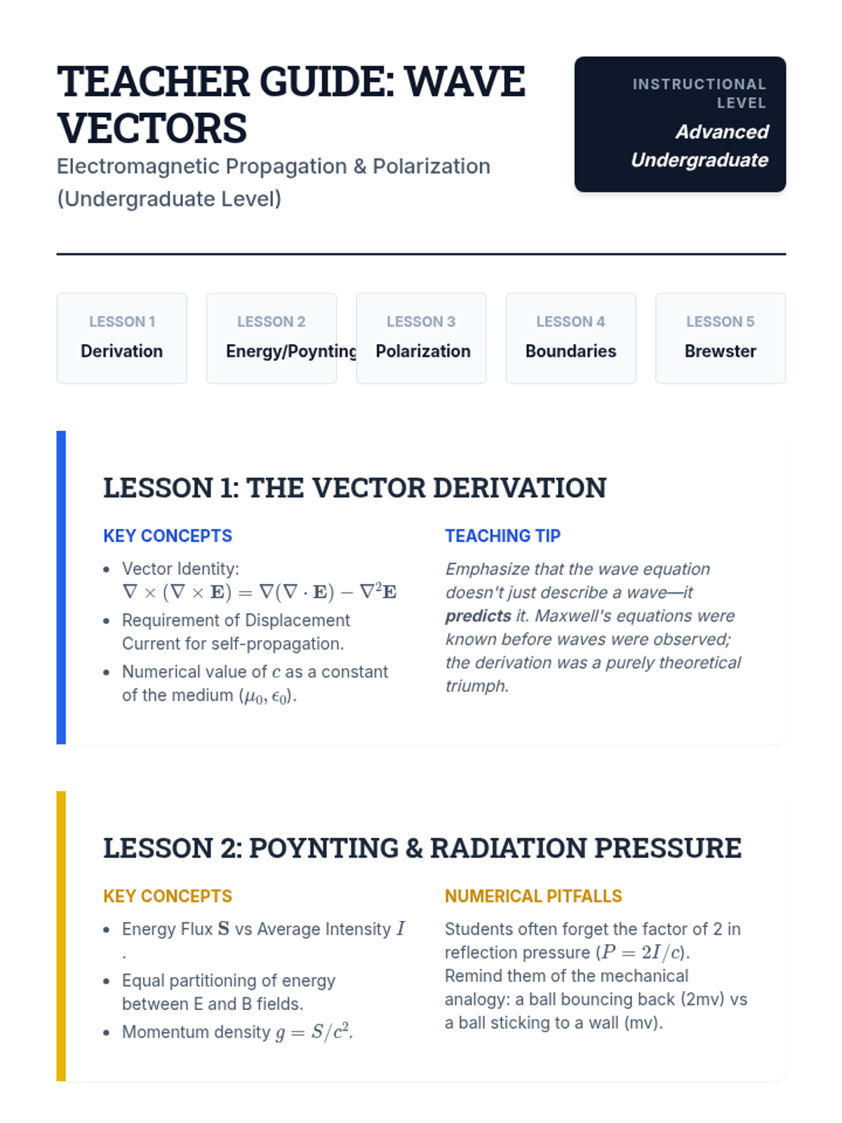 This sequence transitions undergraduate students from mechanical waves to electromagnetic theory, focusing on Maxwell's equations, energy flow via the Poynting vector, and the vector nature of light through polarization and boundary interactions.