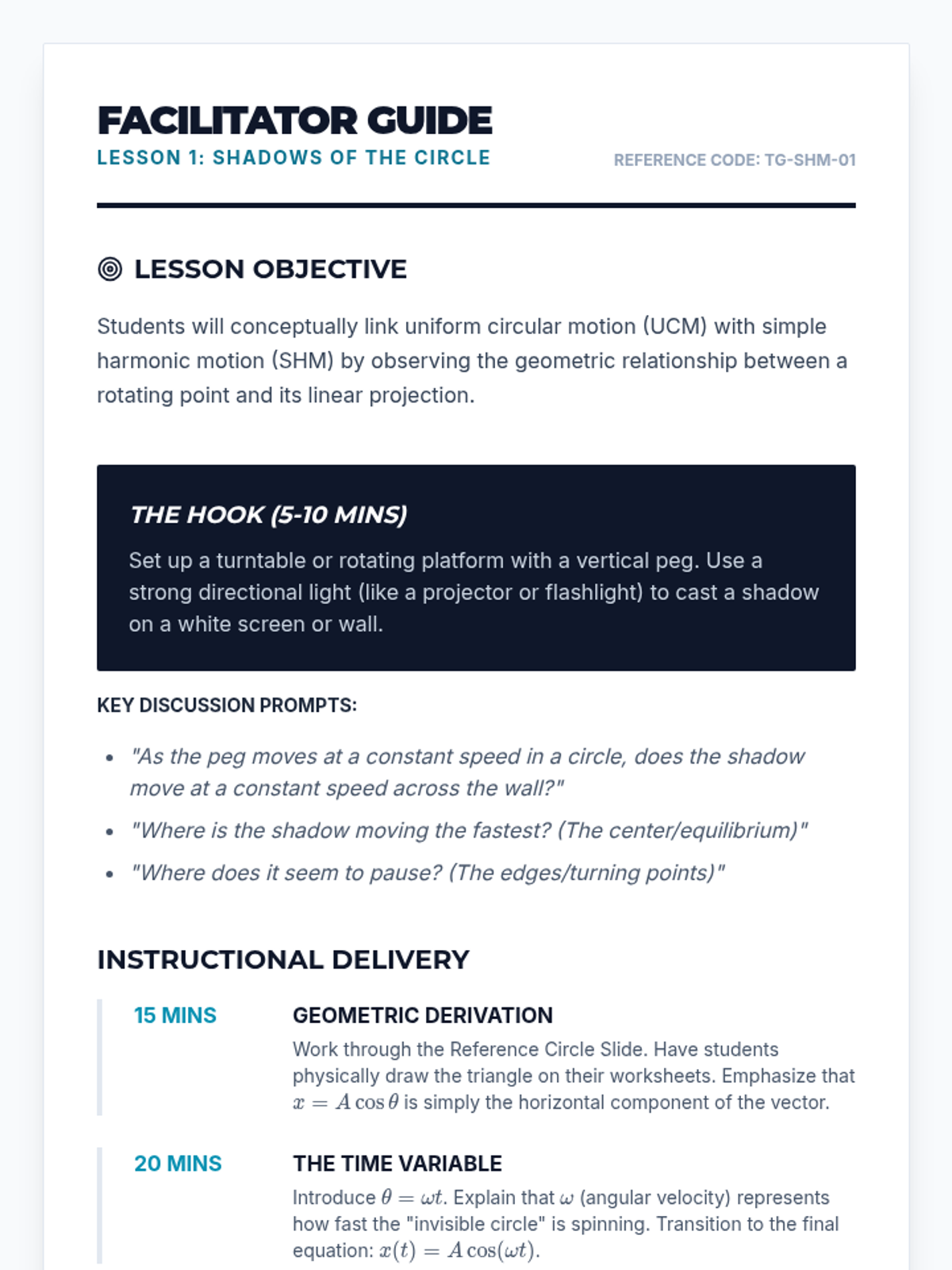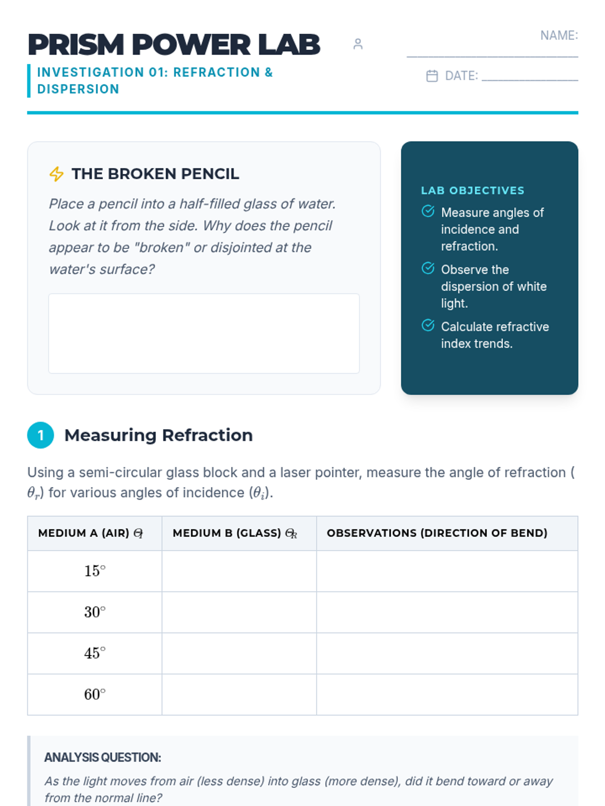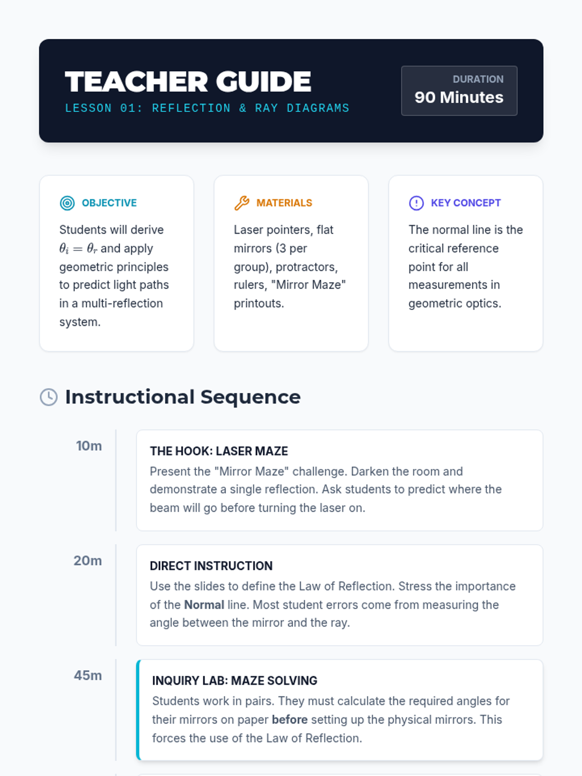 A comprehensive 12th-grade physics sequence exploring the behavior of light. Students investigate reflection, refraction, Snell's Law, total internal reflection, and the mechanics of lenses and optical instruments through ray diagrams and mathematical analysis.