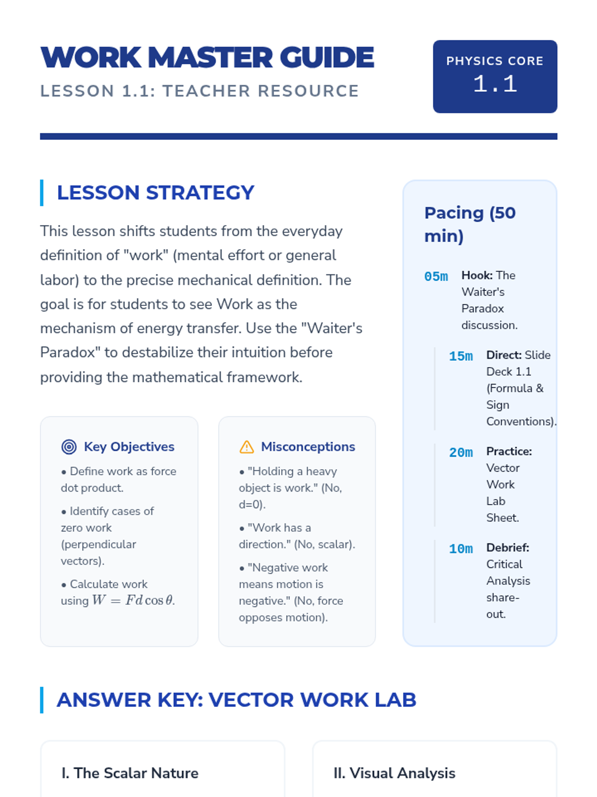 A comprehensive 11th-grade physics sequence exploring work, energy, and power through inquiry and mathematical modeling. Students progress from basic vector work to complex energy conservation scenarios involving both conservative and non-conservative forces.
