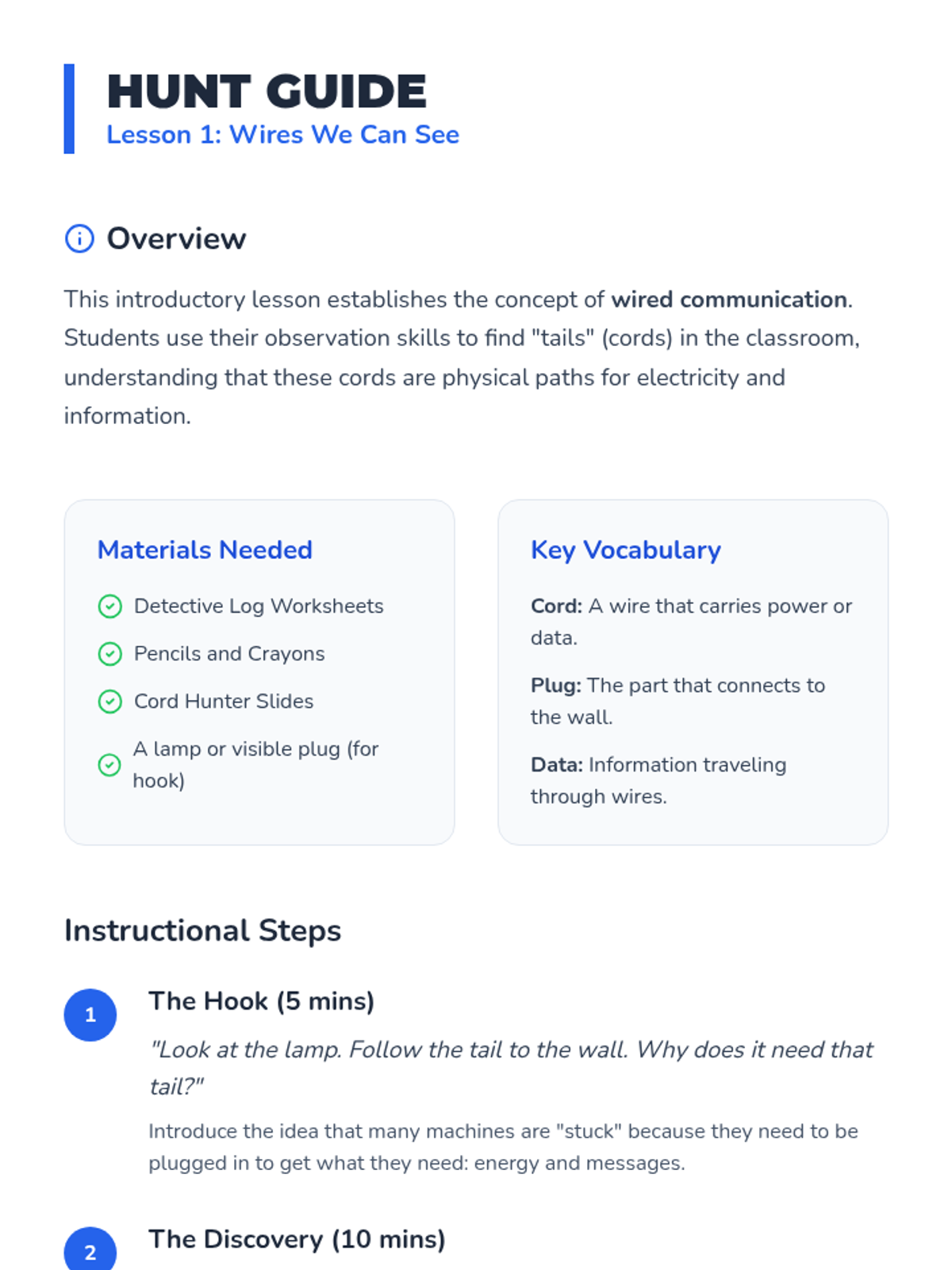 A 1st-grade sequence exploring the difference between wired and wireless communication, using hands-on experiments with cords, remotes, radios, and obstacles to understand how data travels.