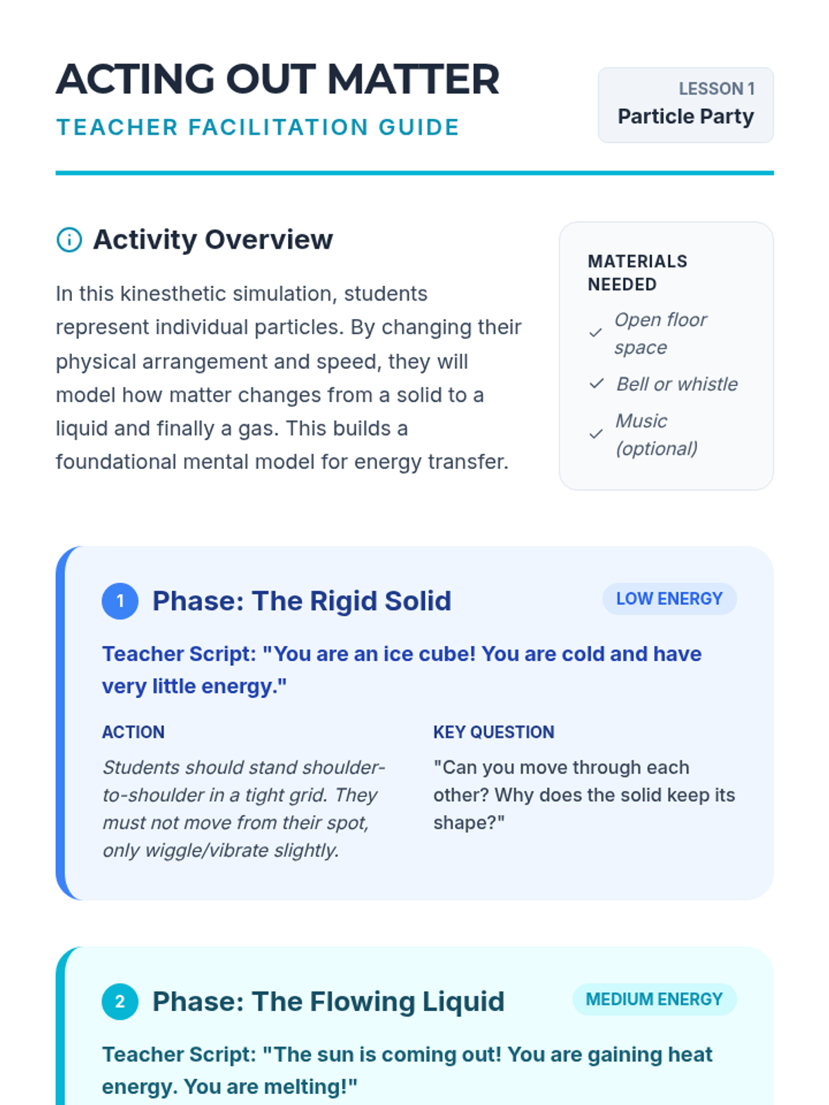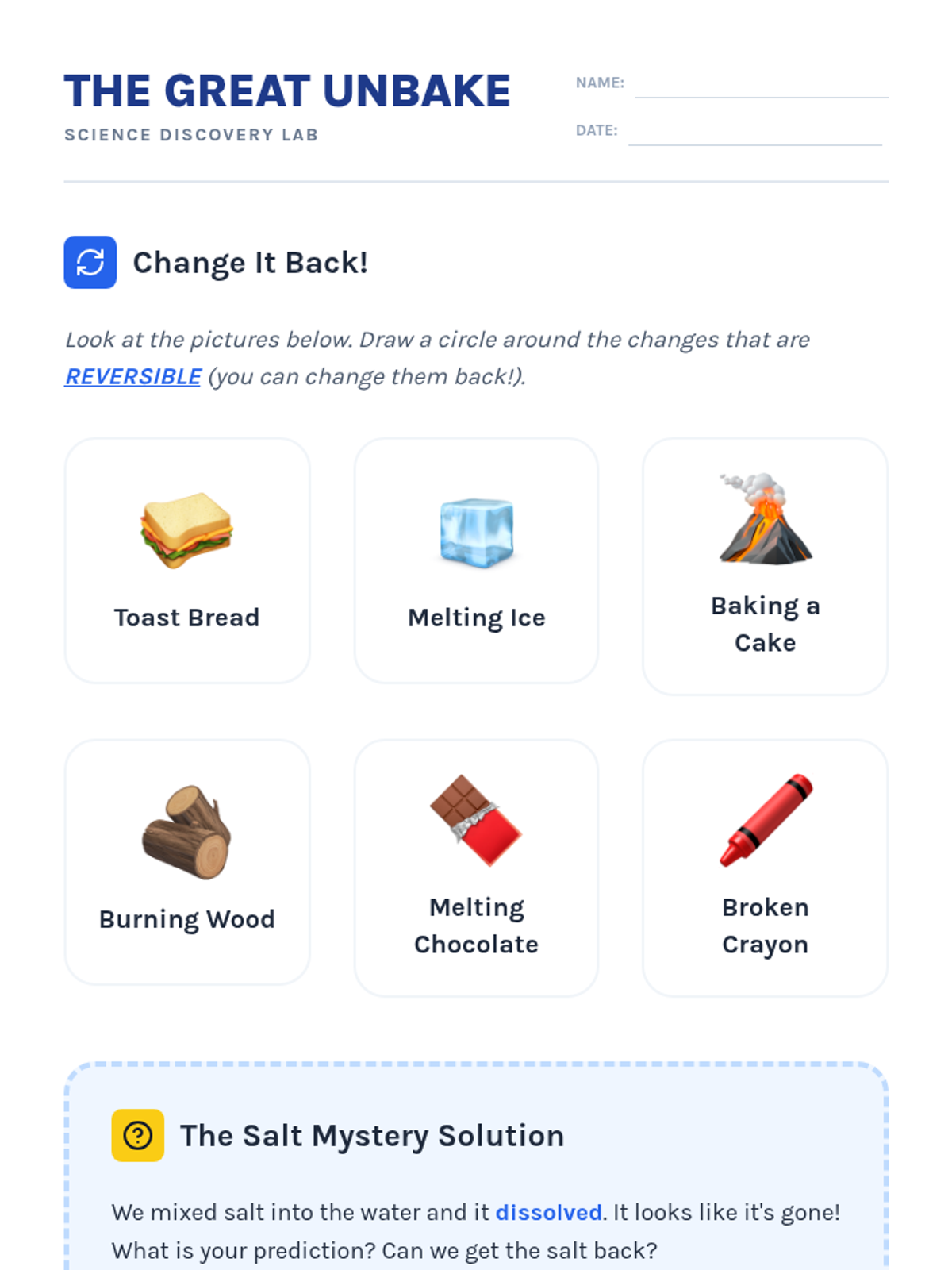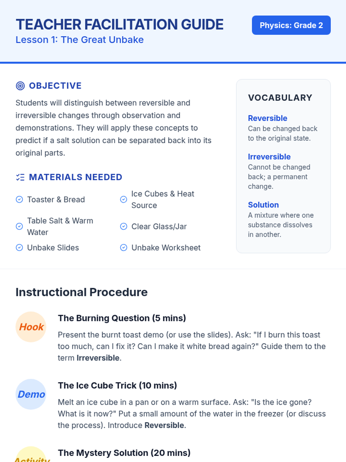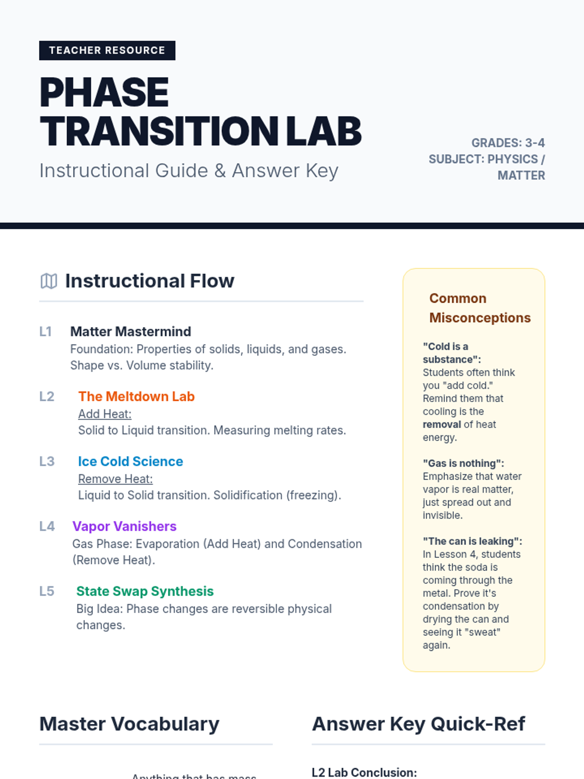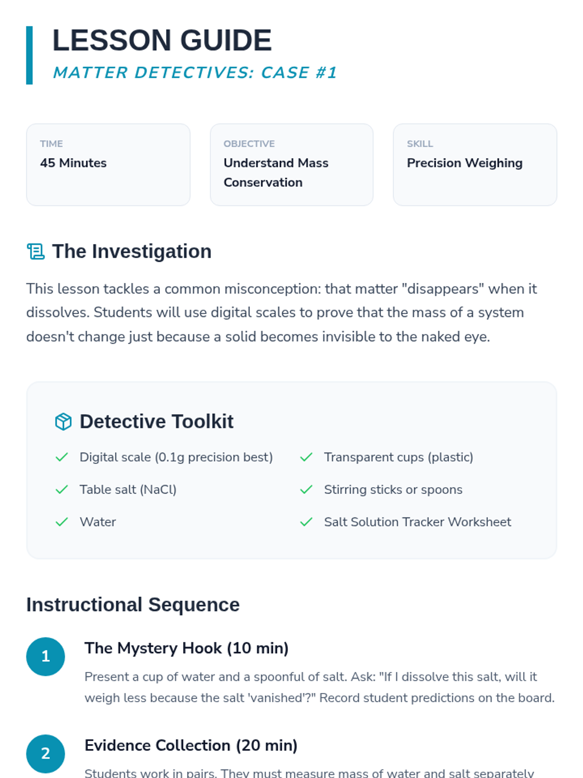 This 5-lesson sequence introduces 1st-grade students to the concept of matter conservation. By observing dissolving solids, changing shapes, and chemical reactions in closed systems, students learn that matter persists even when its form or visibility changes.