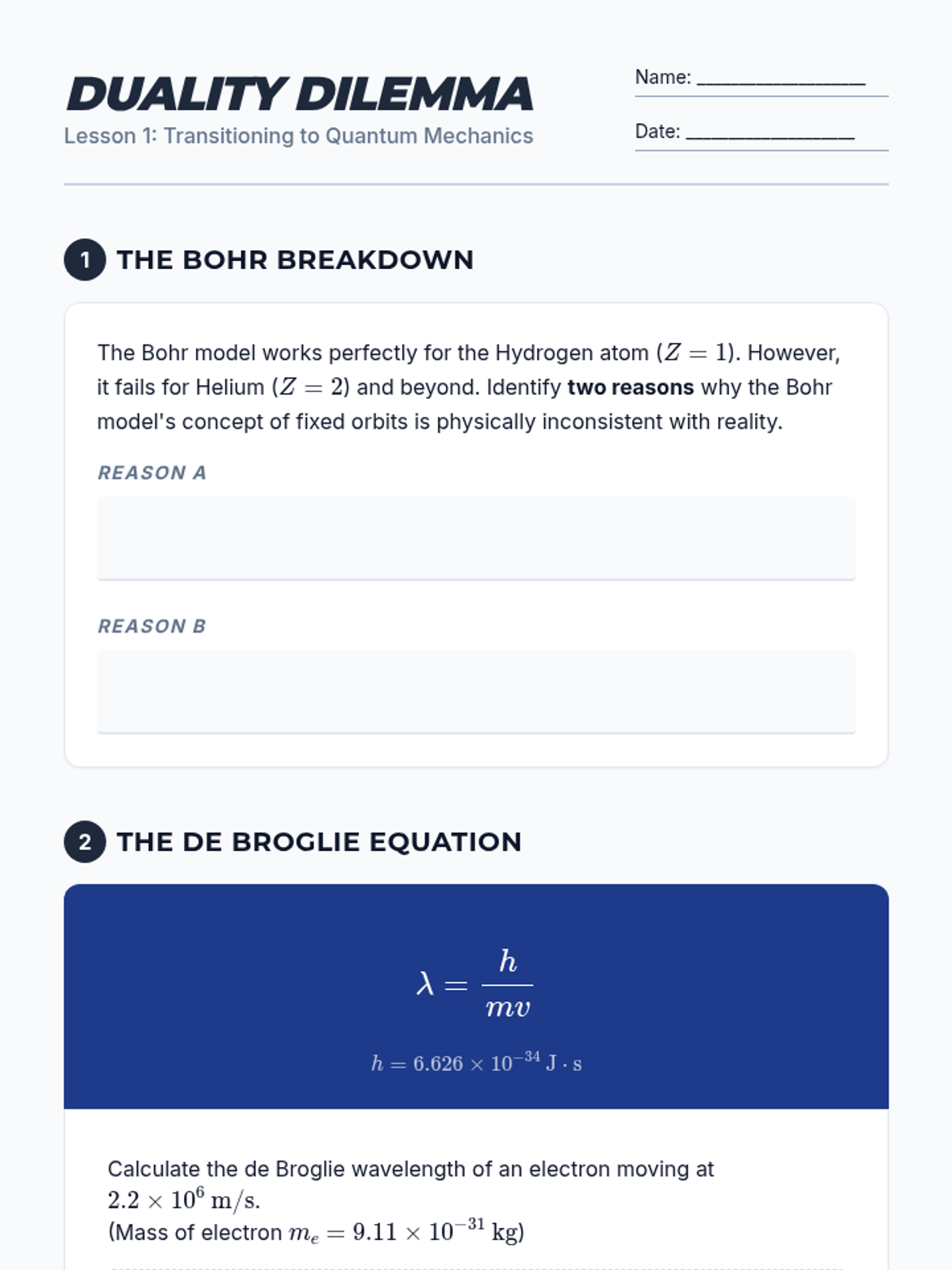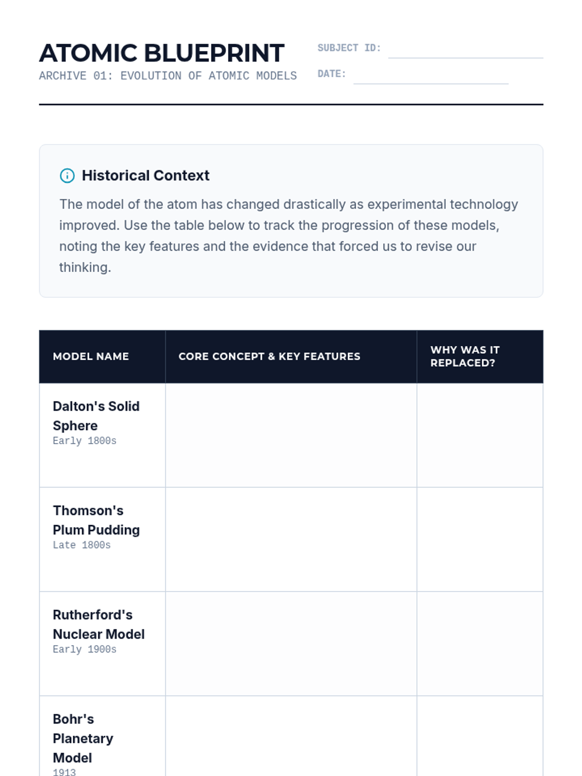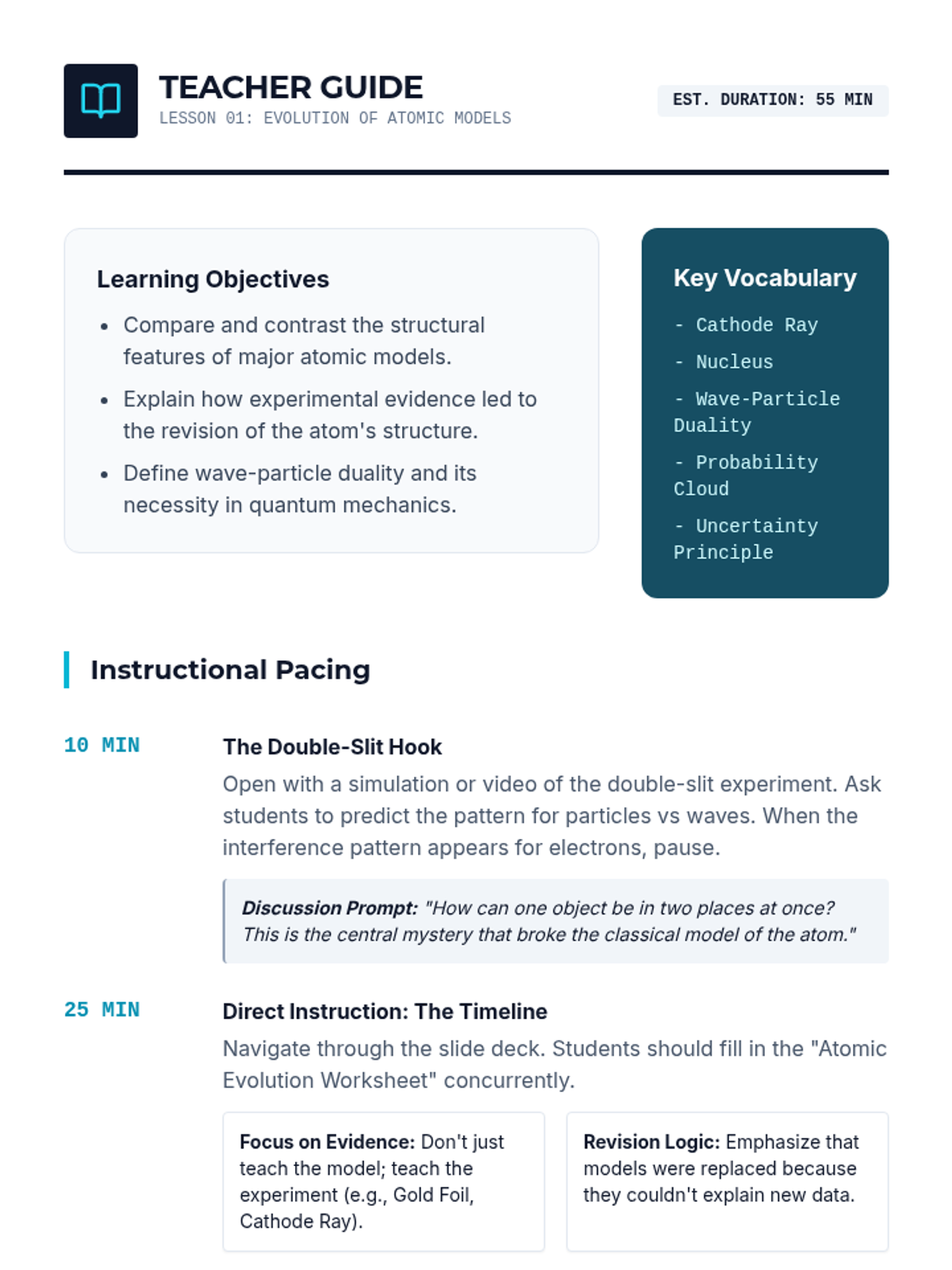 A comprehensive 11th-grade physics sequence exploring the quantum mechanical model of the atom, electron configurations, and the structural logic of the periodic table. Students progress from historical models to mastery of orbital filling rules and periodic blocks.