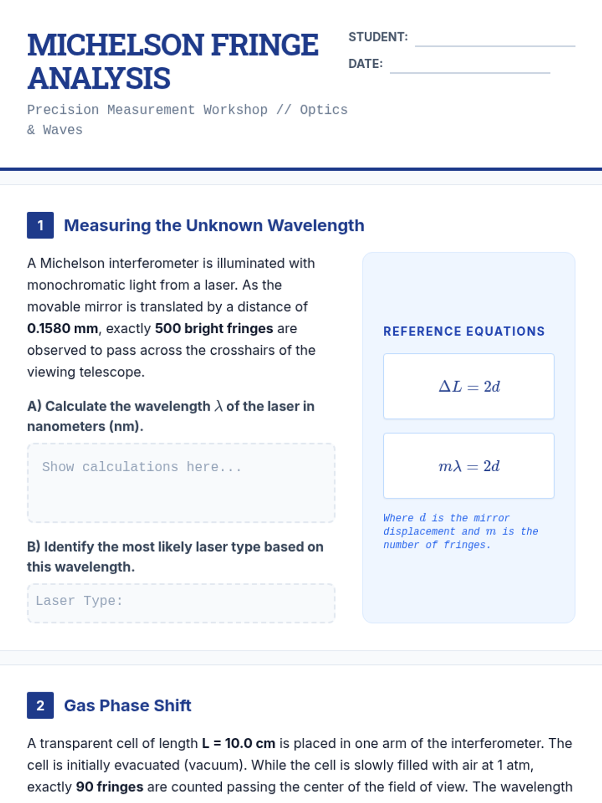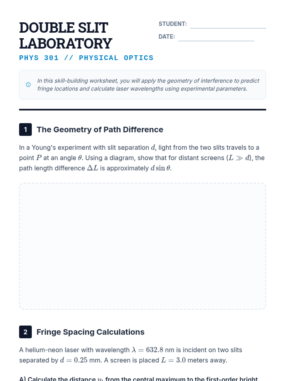 An undergraduate physics sequence exploring the wave nature of light through interference and diffraction. Students use phasor diagrams, calculus, and the Rayleigh criterion to analyze patterns from various aperture configurations and define the fundamental limits of optical resolution.