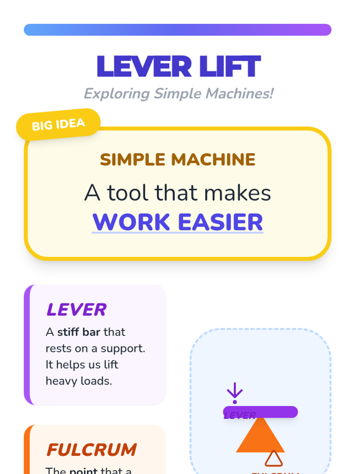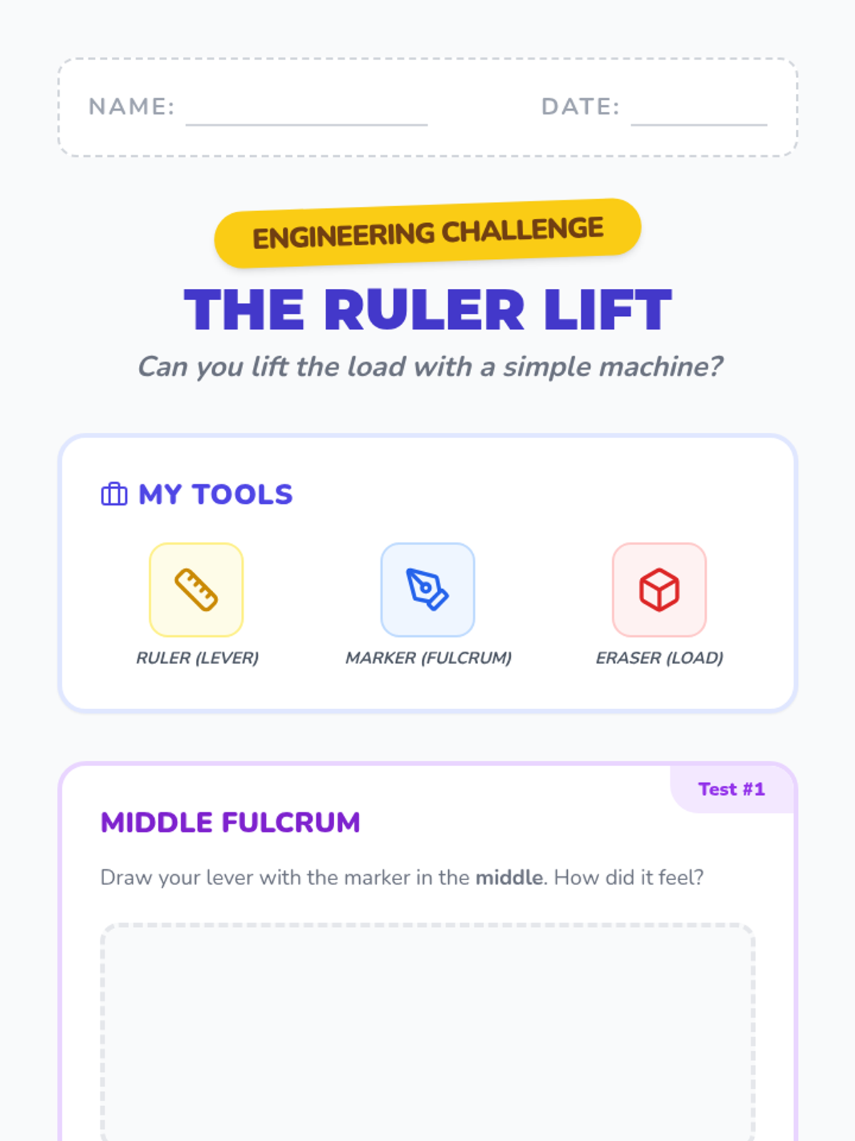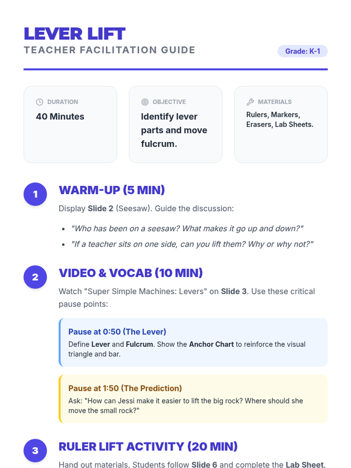 A hands-on introductory sequence for early elementary students to explore the mechanics of levers and fulcrums using everyday classroom objects.