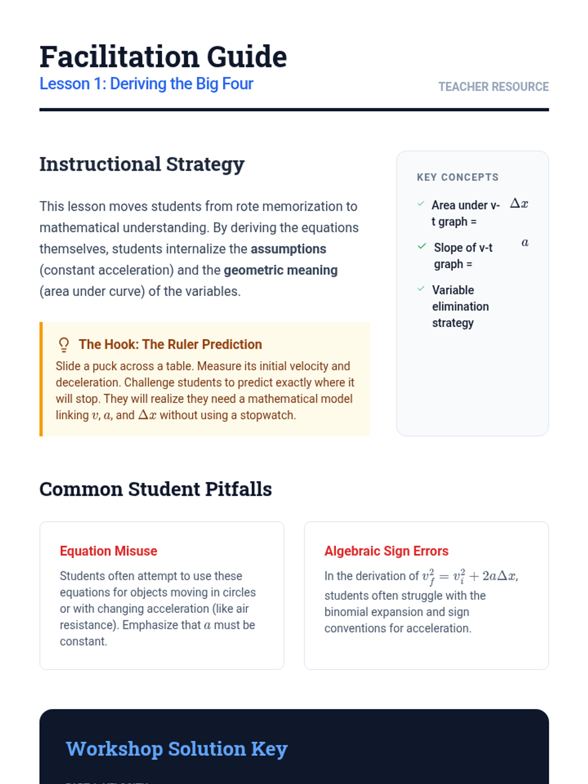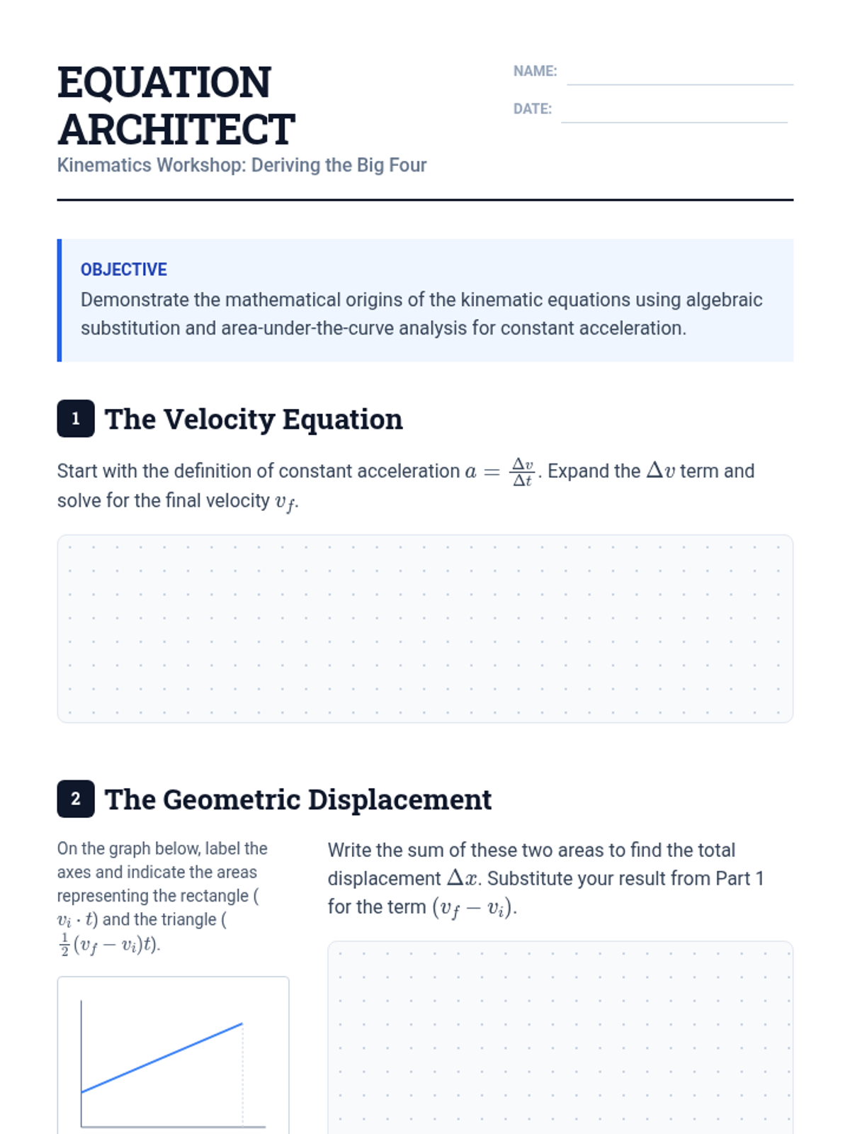 This sequence guides undergraduate students through the systematic derivation and application of the four kinematic equations for constant acceleration, moving from basic algebraic modeling to complex multi-stage and two-body intercept problems.