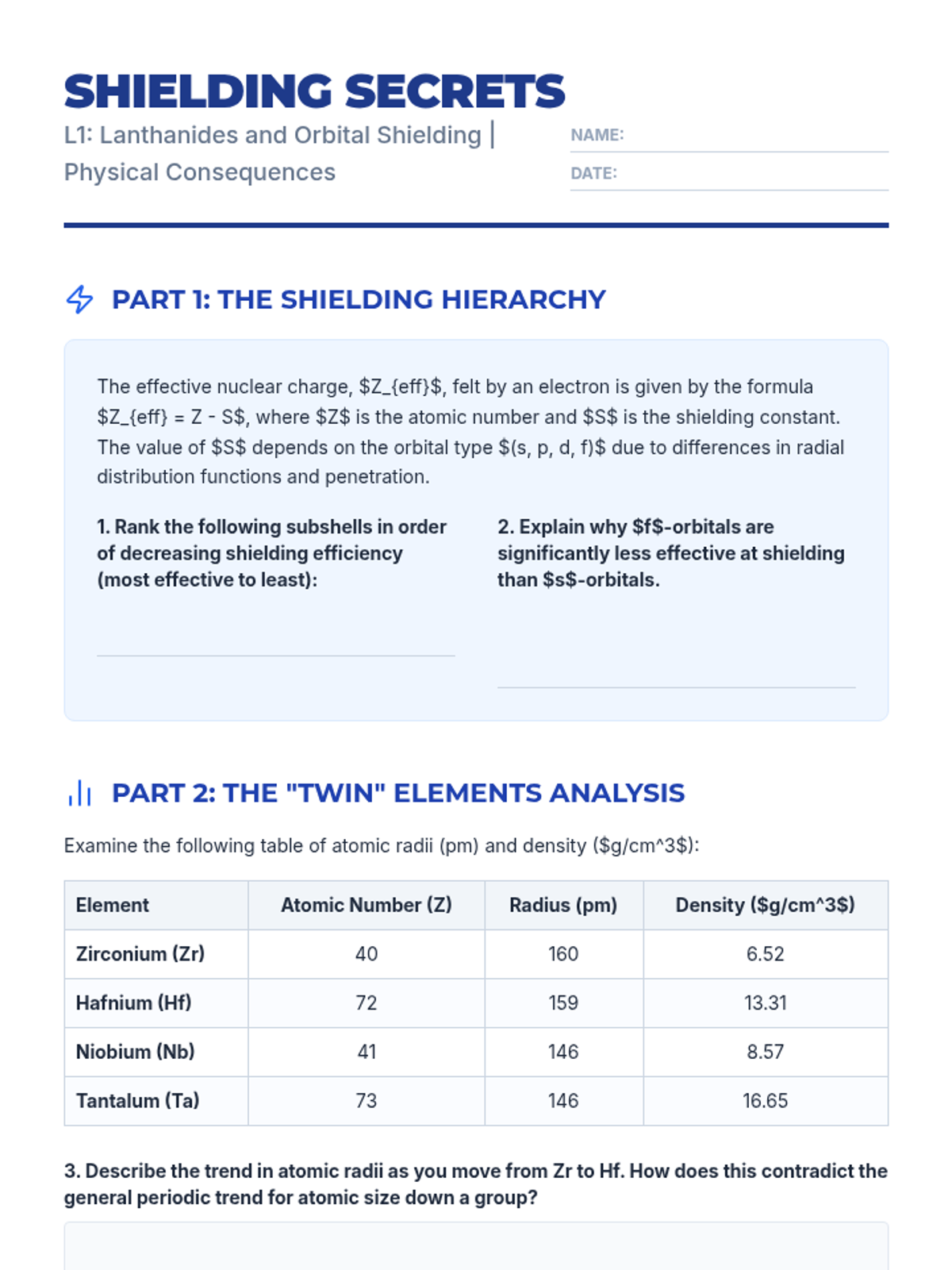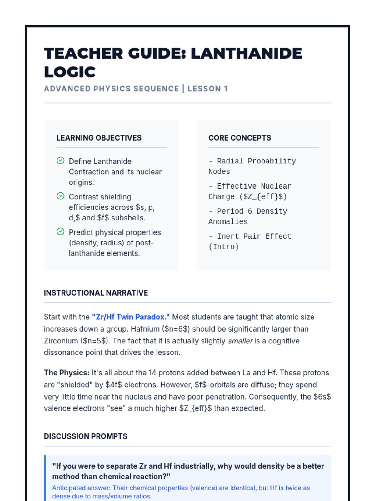 This advanced physics sequence explores the f-block elements and the frontiers of the periodic table. Students investigate the lanthanide contraction, nuclear stability, and the profound impact of relativistic effects on chemical properties at high atomic numbers, culminating in an analysis of the theoretical limits of matter and the 'Island of Stability'.