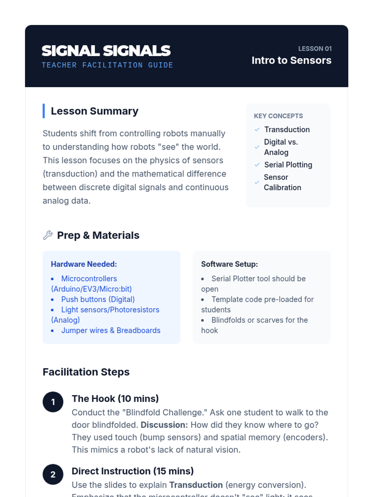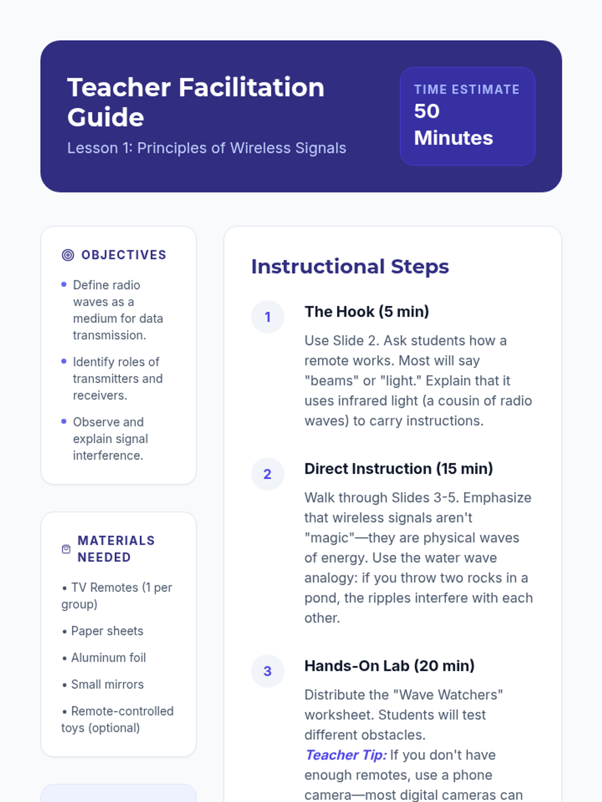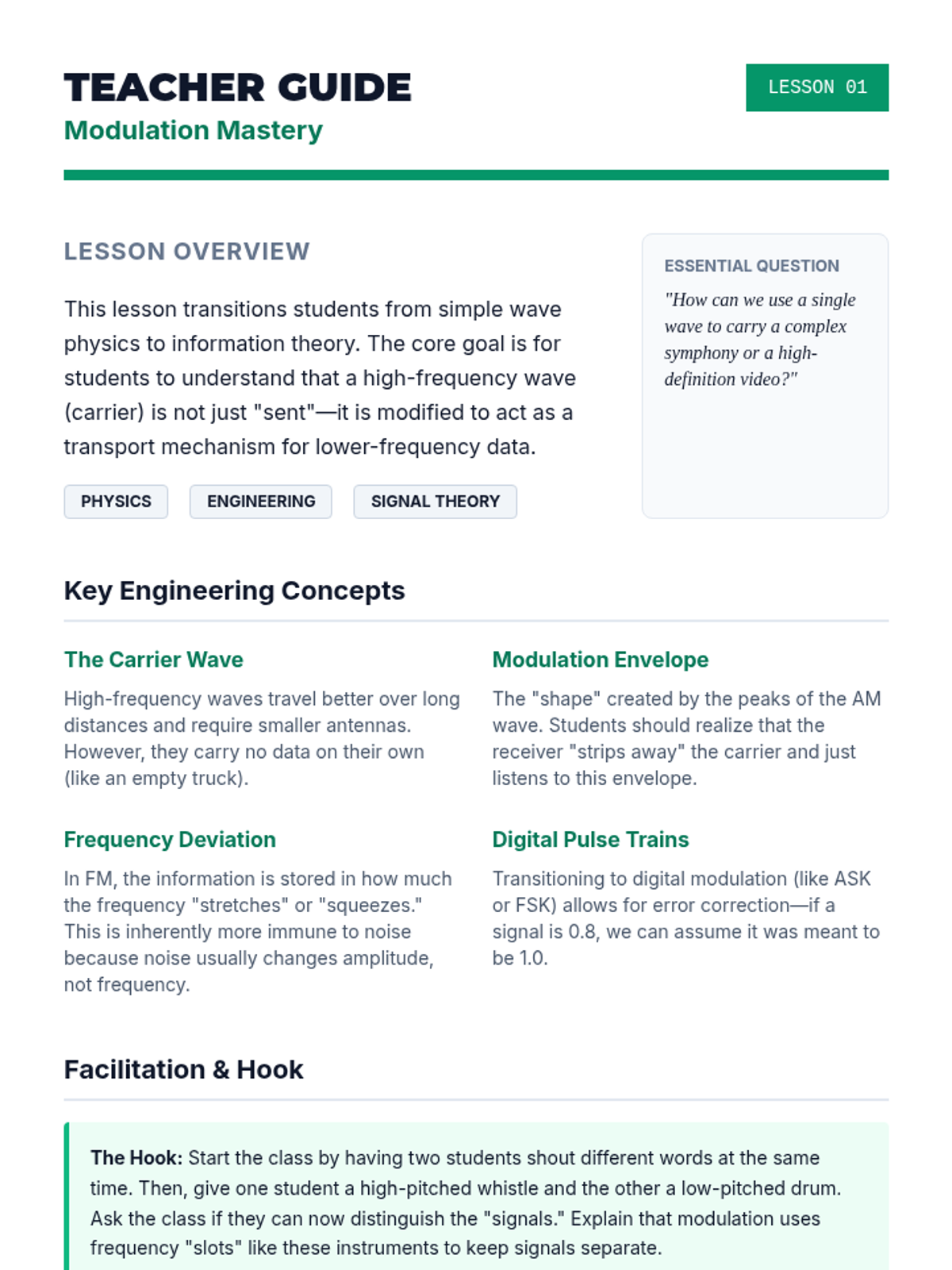 This 12th-grade engineering sequence explores the physics of electromagnetic waves through the lens of wireless communication. Students learn how information is modulated onto carrier waves, how antenna geometry relates to wavelength, and how environmental factors like attenuation and interference affect signal integrity. The unit concludes with a design challenge requiring students to architect a communication link for a remote environment.