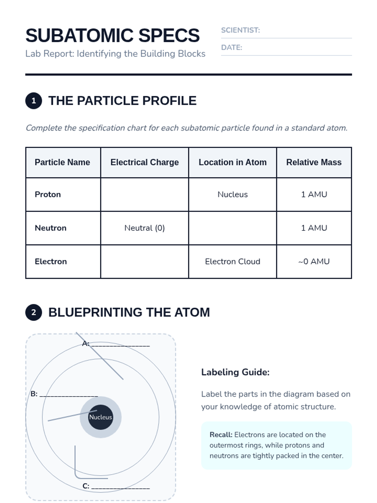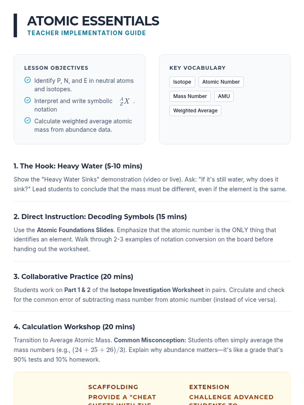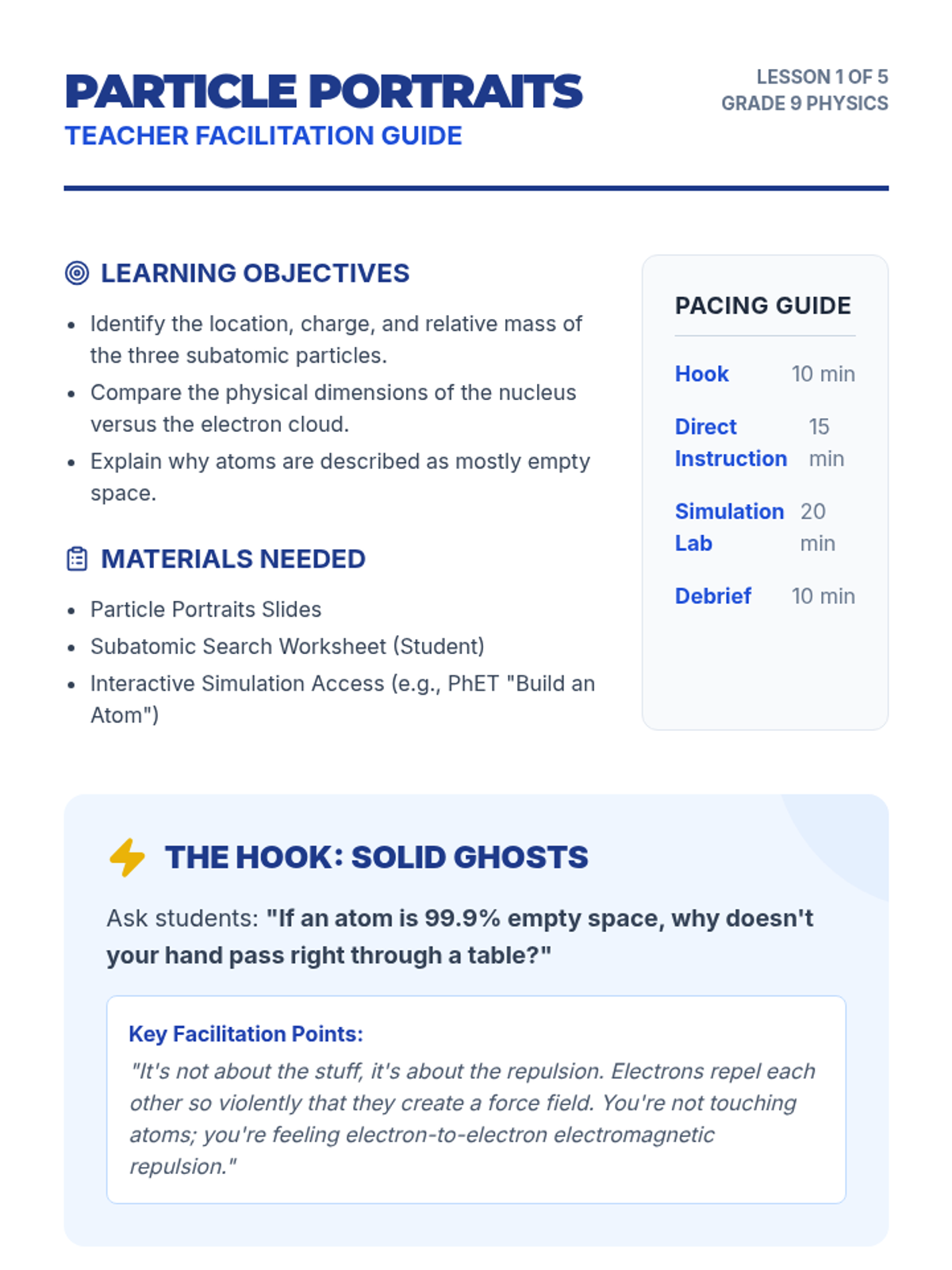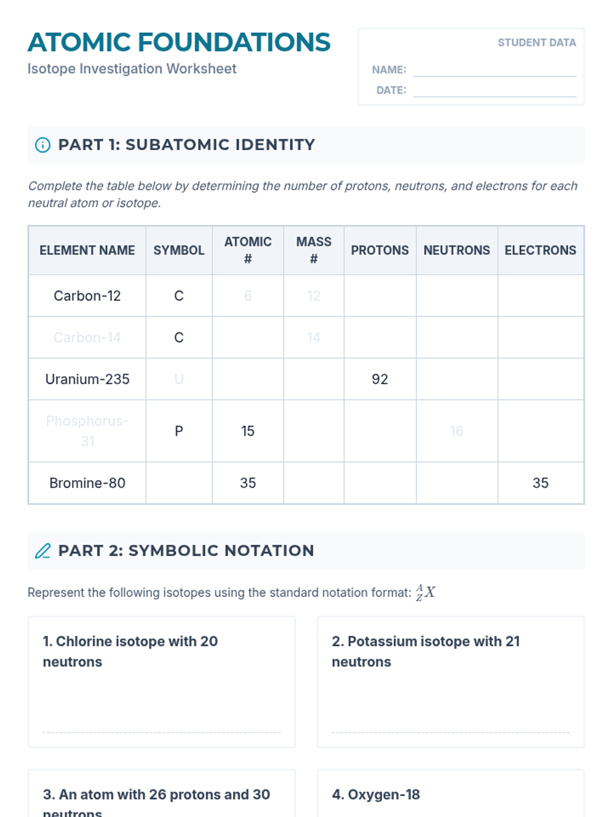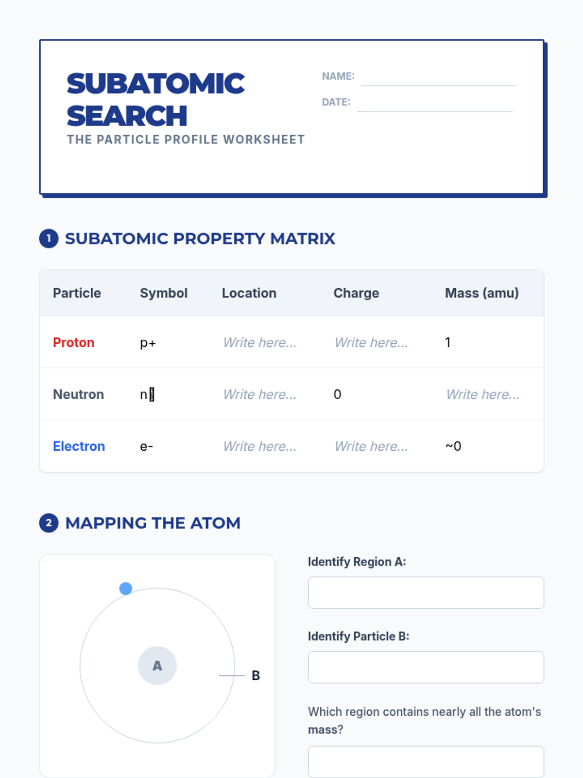 A comprehensive 9th-grade physics sequence exploring the internal structure of atoms. Students move from identifying subatomic particles to calculating atomic mass, understanding isotopes, drawing Bohr models, and analyzing ion formation.
