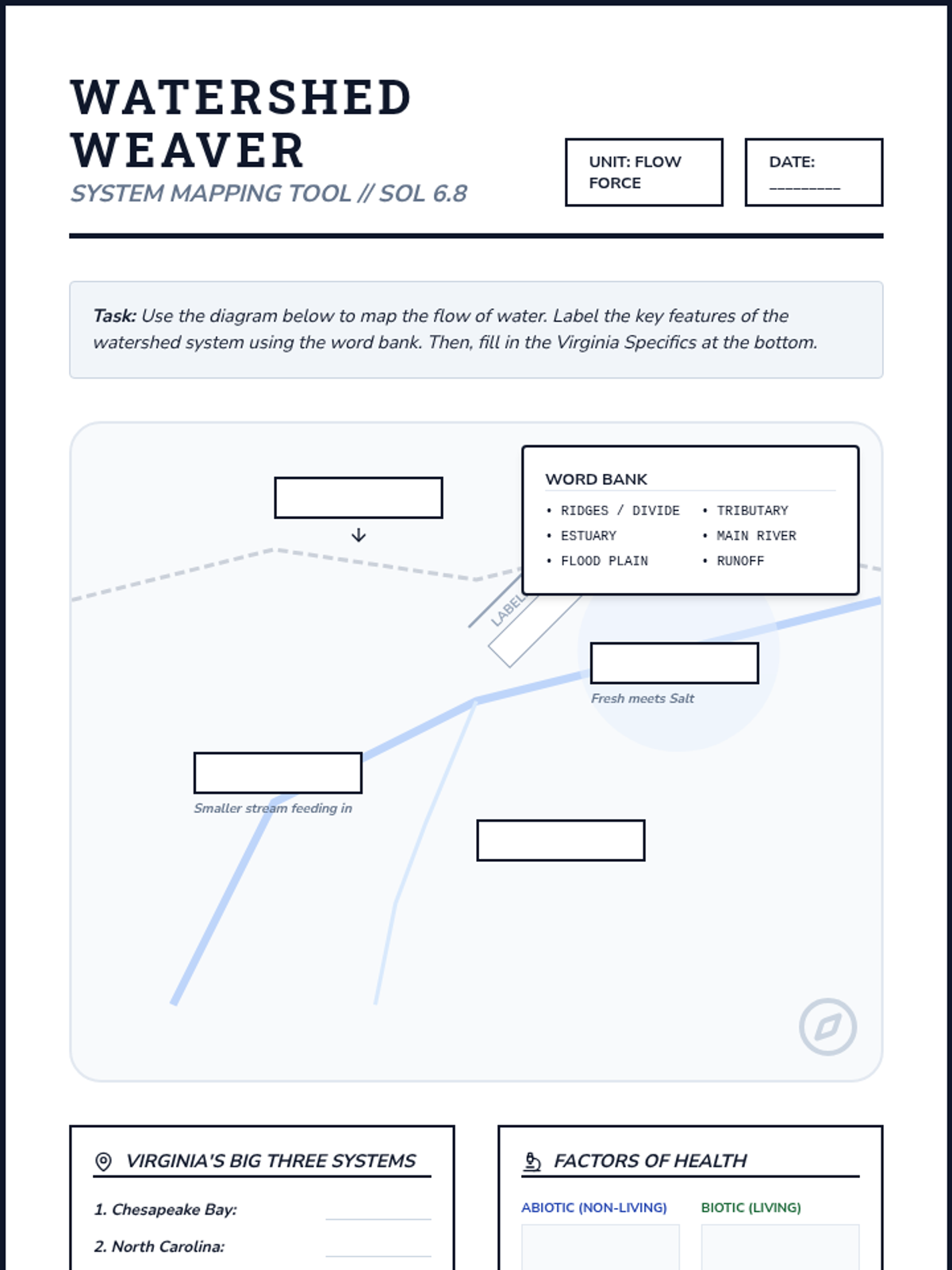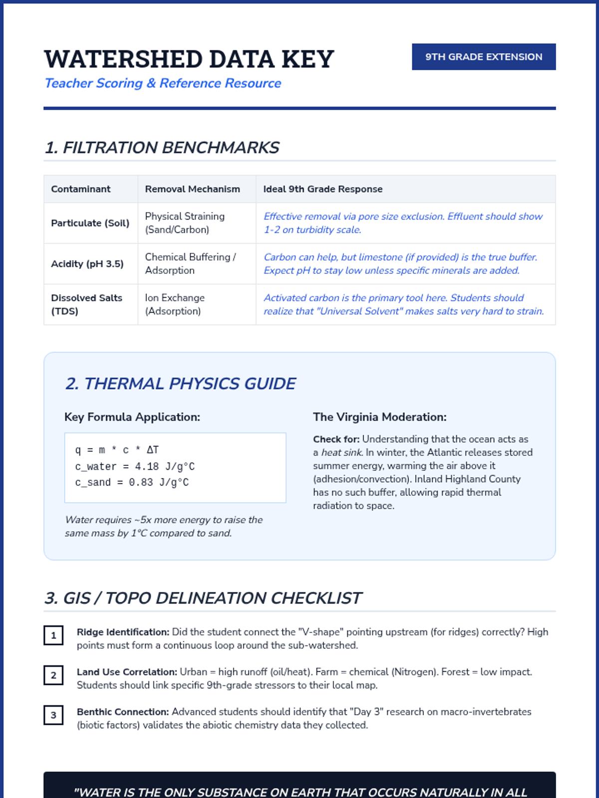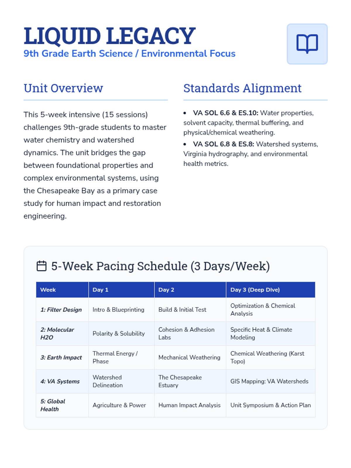 A comprehensive 5-week sequence exploring the physical properties of water, the engineering of water filtration, and the complex systems of Virginia's watersheds. Students move from hands-on engineering to chemical properties and finally to large-scale environmental systems.
