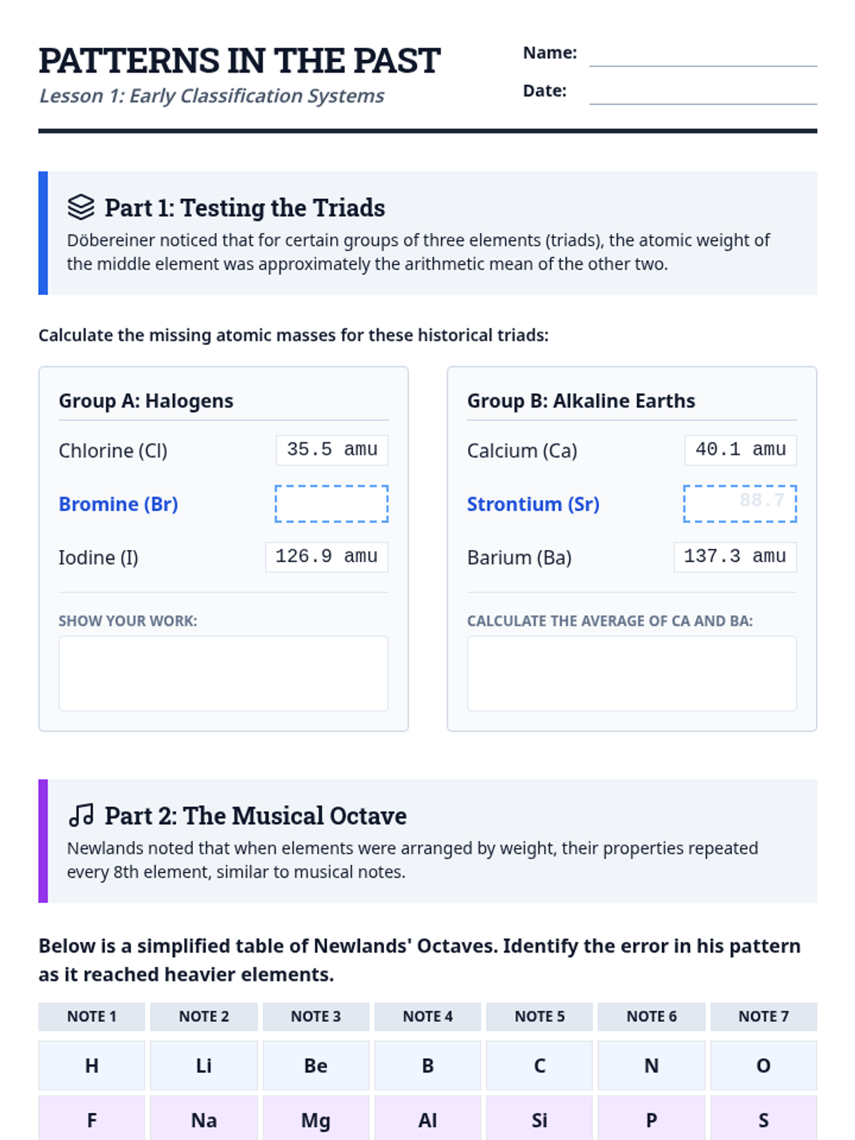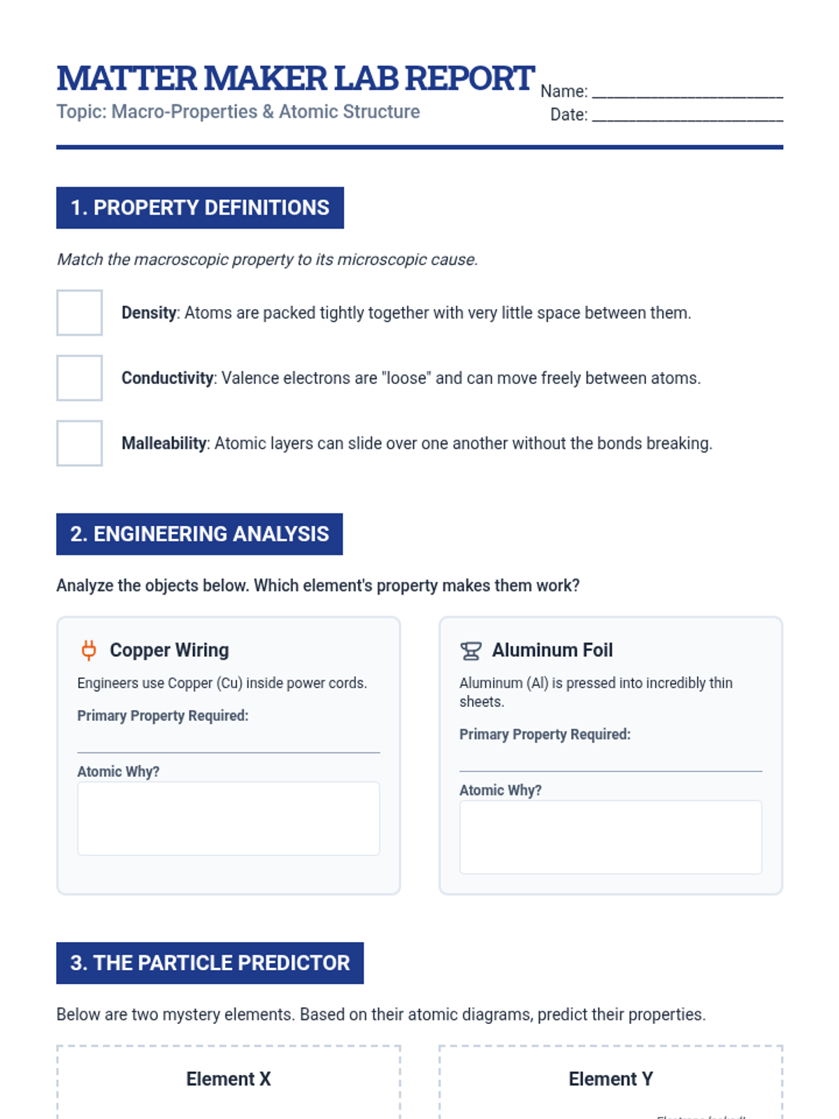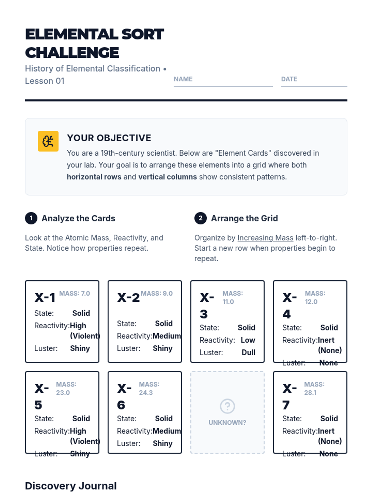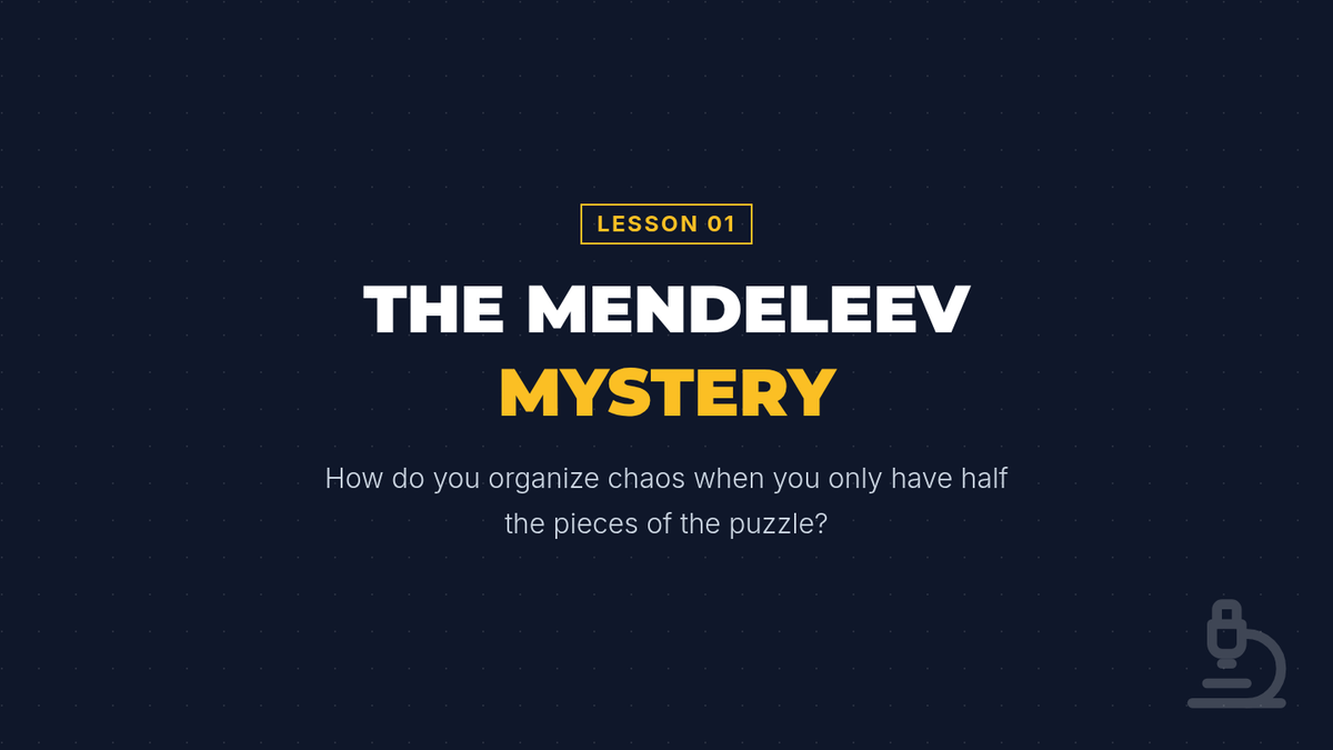 A comprehensive 9th-grade physics unit on the organization, history, and predictive power of the Periodic Table. Students explore patterns, classify elements, and use periodic trends to solve logic puzzles and predict properties of unknown matter.