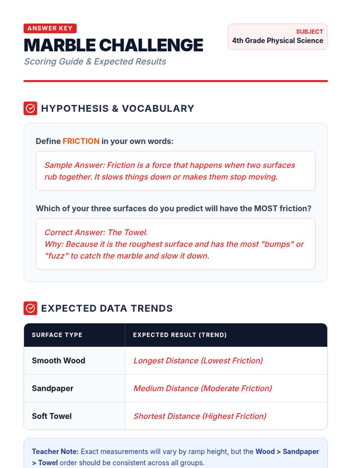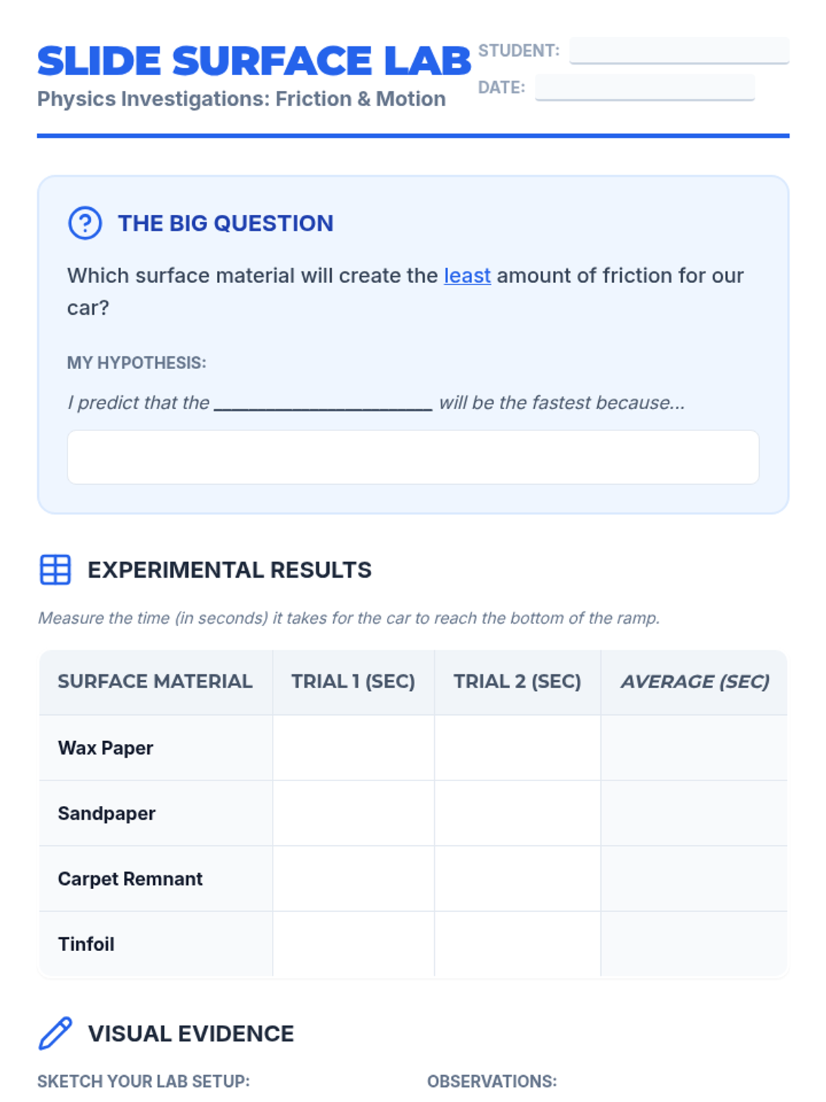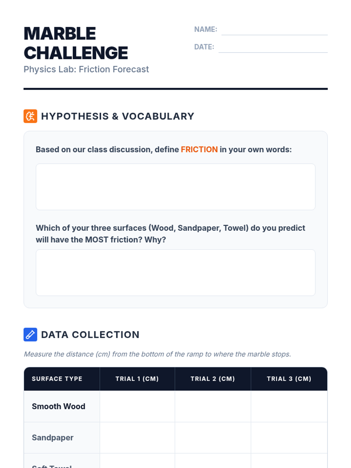 A science investigation into the forces of gravity and friction, specifically focusing on how surface materials affect the speed of objects on a slide. Students use mini-ramps and various materials to test their hypotheses.