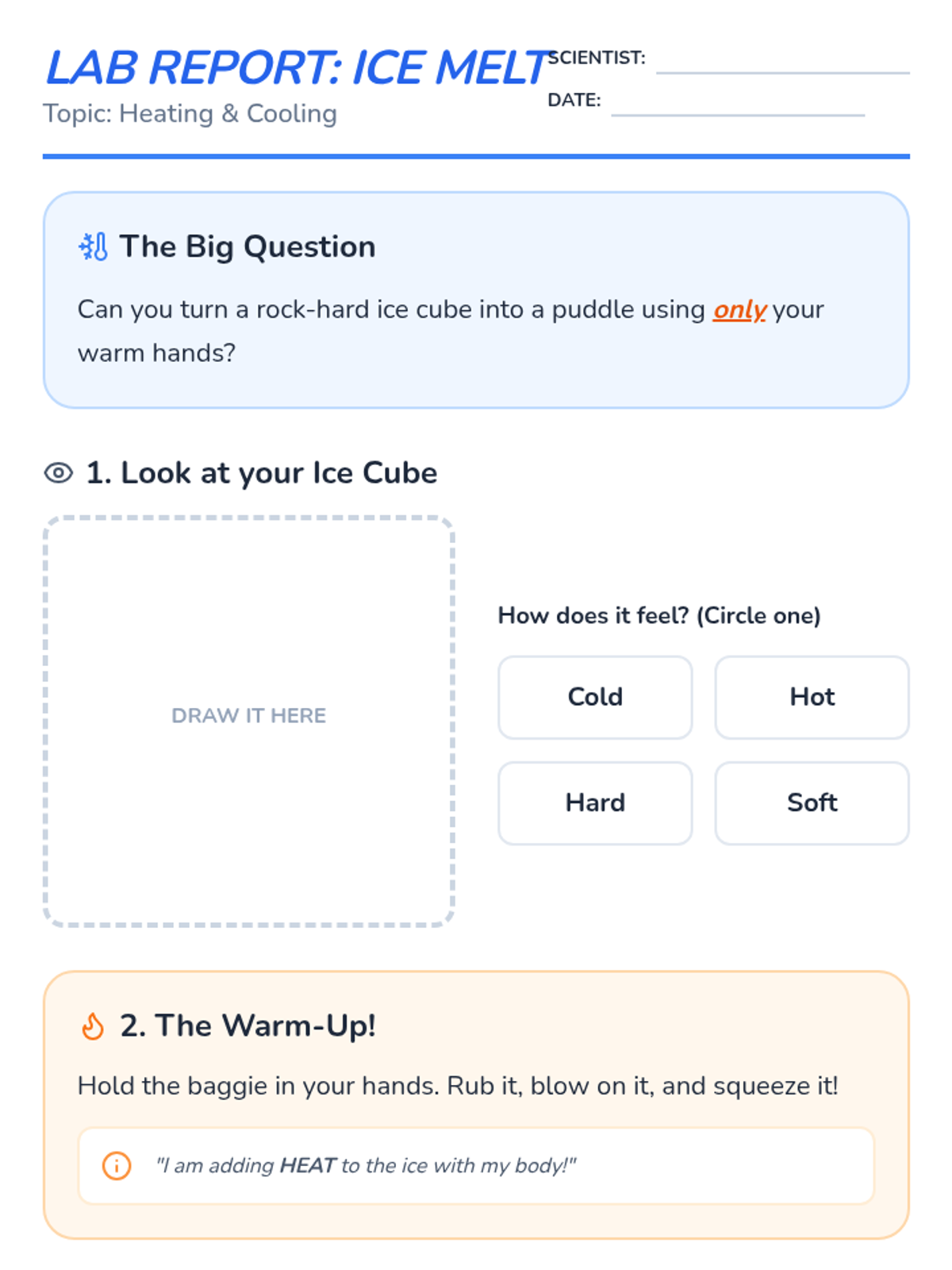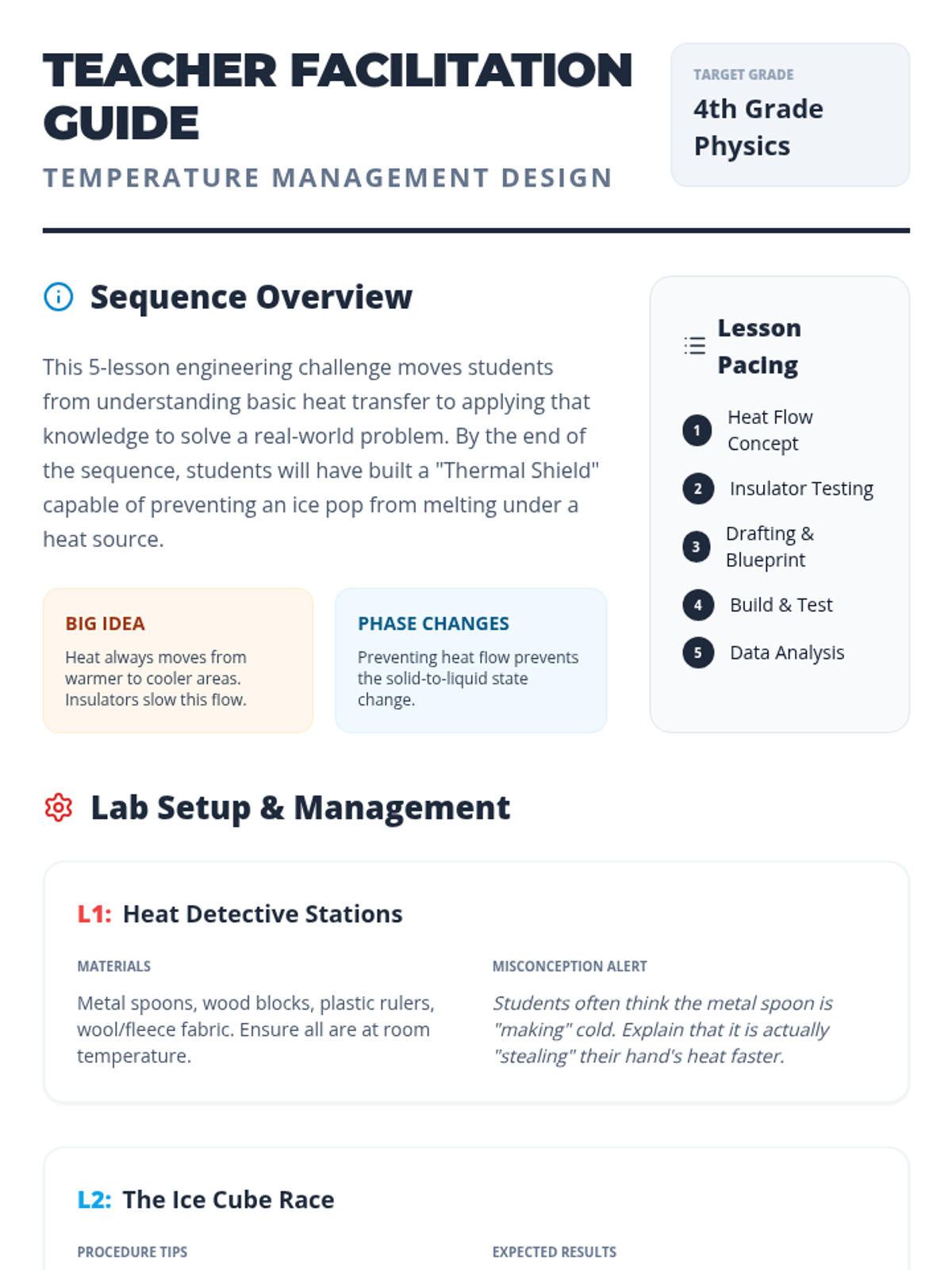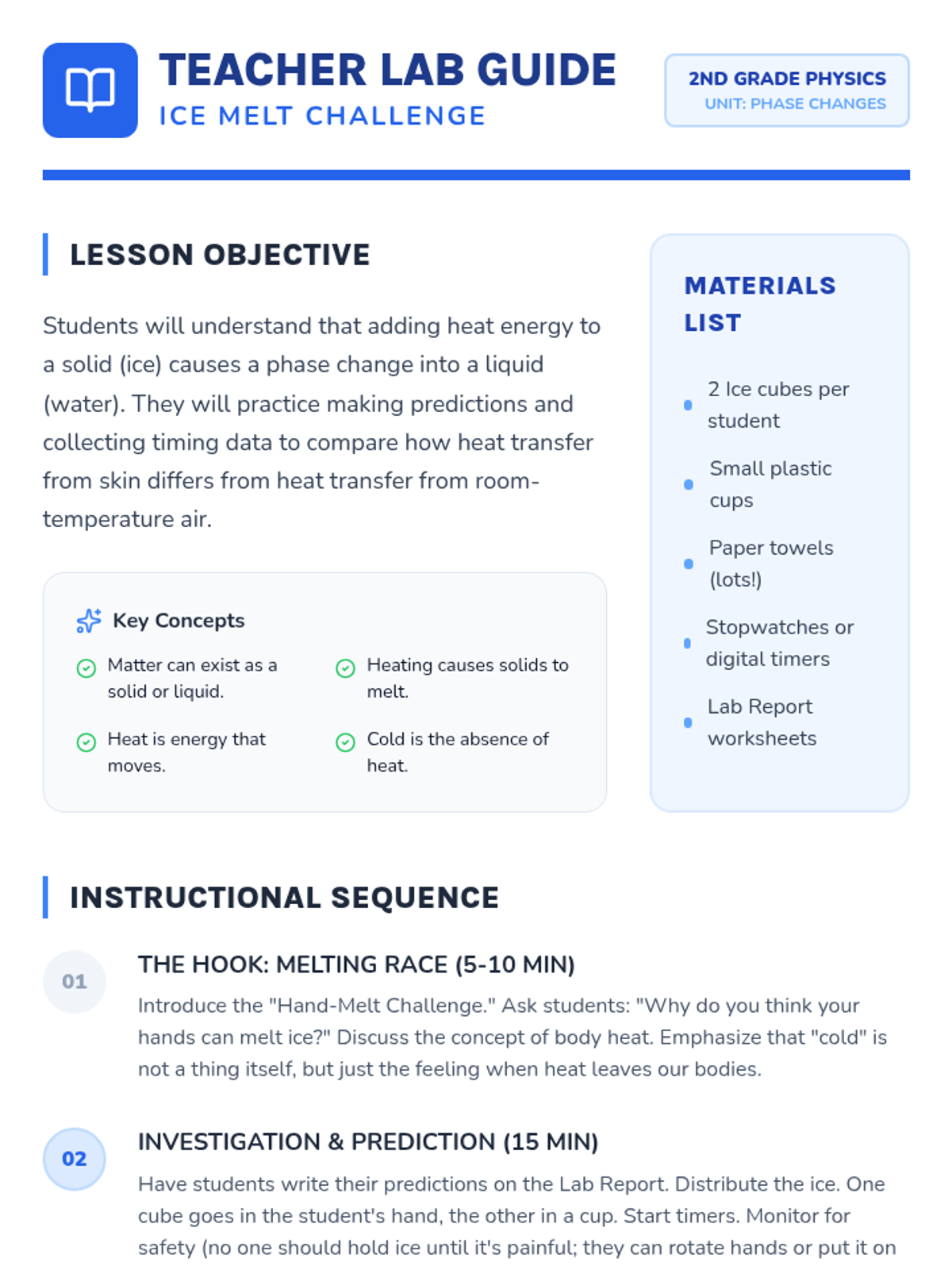 A 2nd-grade engineering sequence where students explore heat transfer and insulation to design a device that prevents an ice pop from melting. Students test materials, create blueprints, and build prototypes for their 'Cold Keeper' invention.