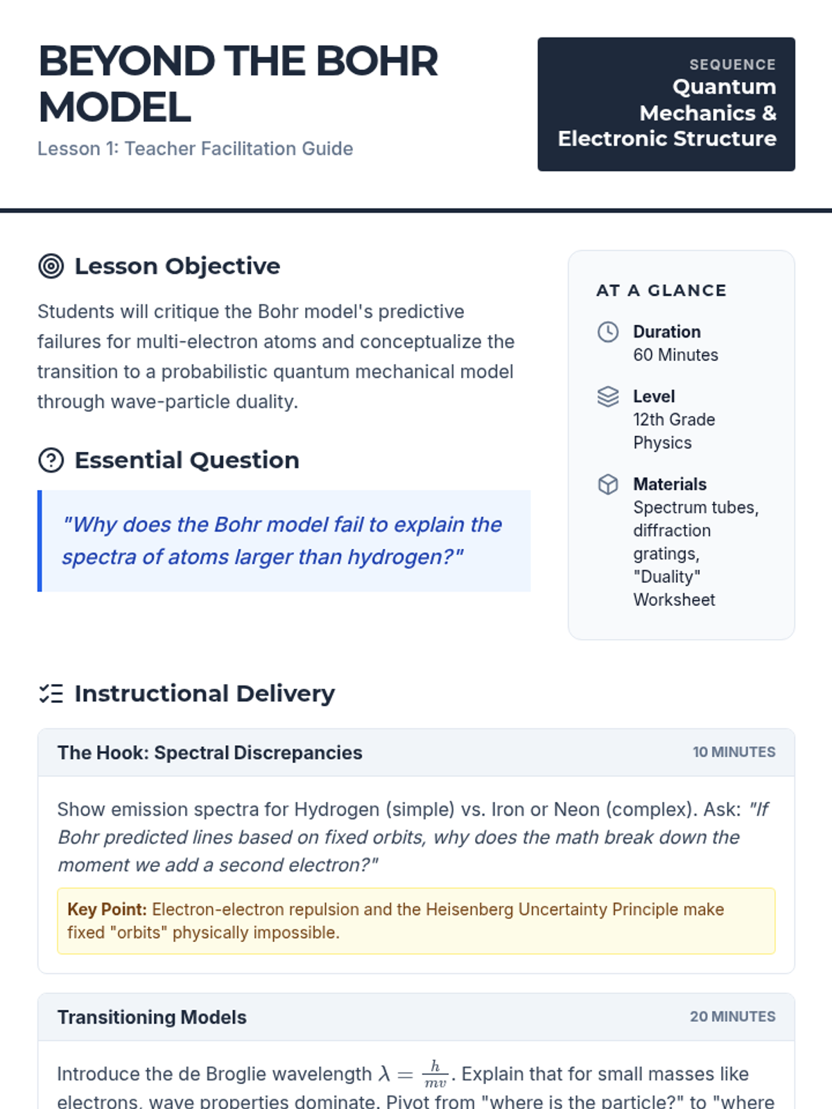 This sequence explores the transition from classical to quantum physics through the lens of atomic structure. Students will investigate the limitations of the Bohr model, the four quantum numbers, orbital geometry, and the principles governing electron configurations to understand the periodic table's organization.