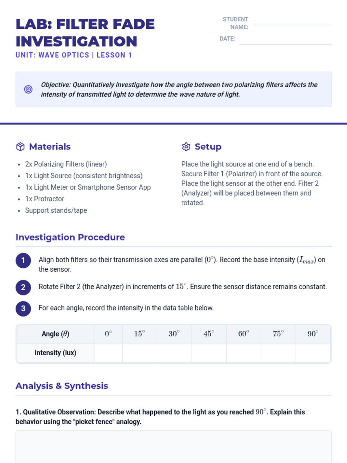 An inquiry-driven physics sequence exploring the wave nature of light through reflection, refraction, diffraction, and polarization, culminating in applications of optical technology.