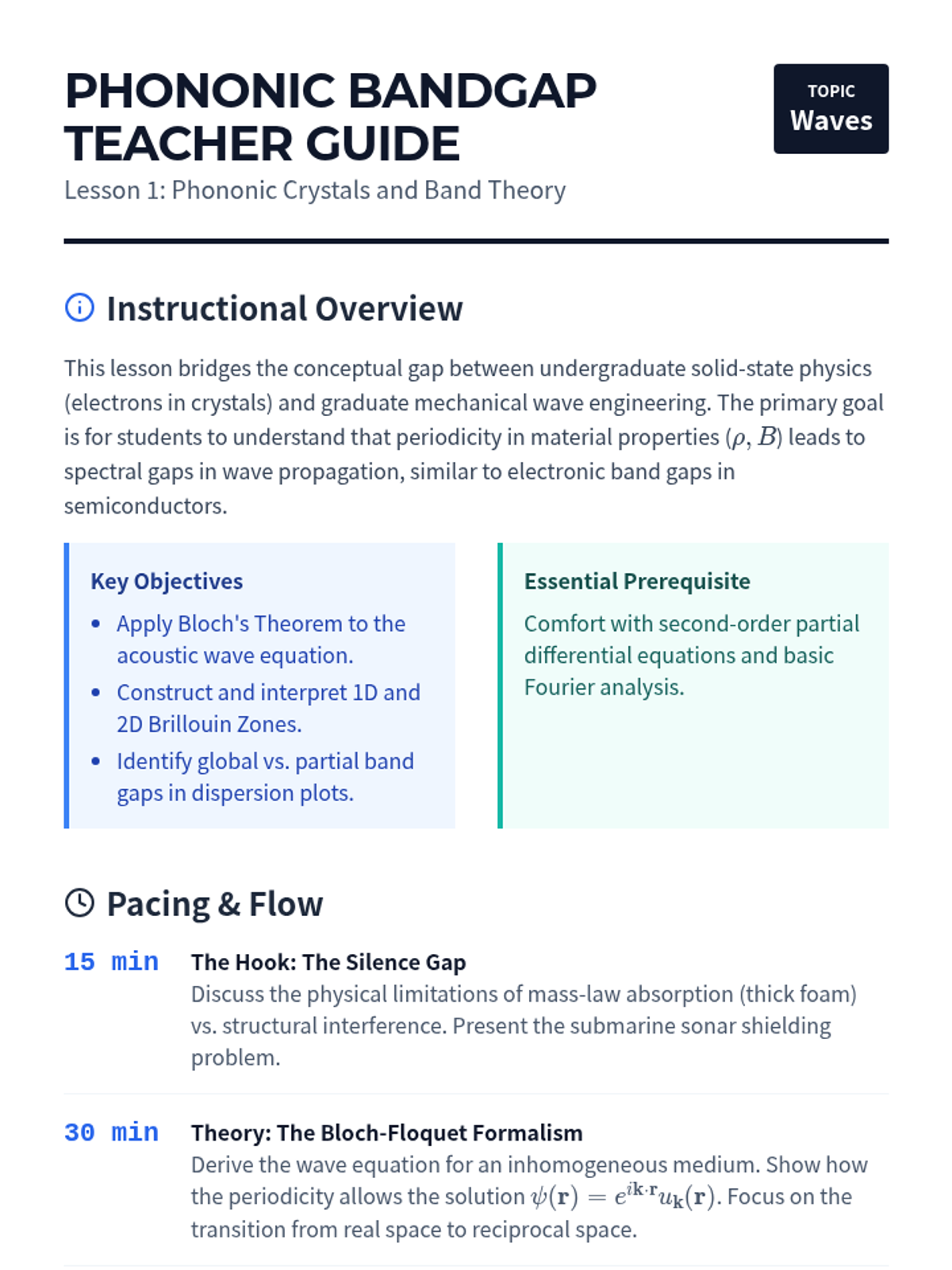 This advanced graduate-level sequence explores the engineering of acoustic metamaterials, covering phononic crystals, negative refraction, transformation acoustics, solitons, and topological states. Students bridge the gap between solid-state physics theory and mechanical engineering to design materials with properties that defy conventional physical intuition.