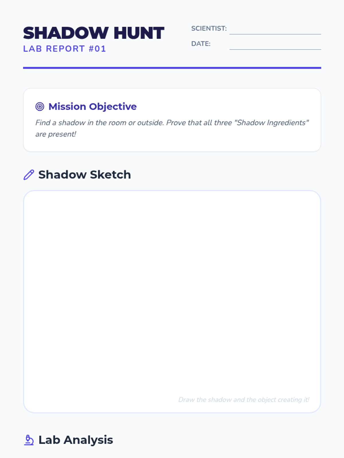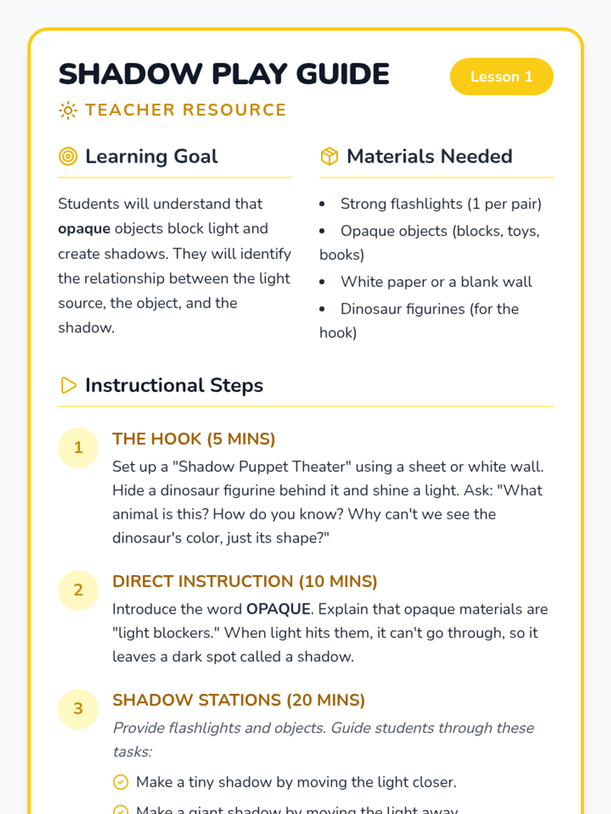 An inquiry-based exploration for Kindergarteners to understand light sources, the formation of shadows, and how moving objects can change shadow size and shape. Students move from classroom investigations to outdoor observations and creative shadow puppet storytelling.