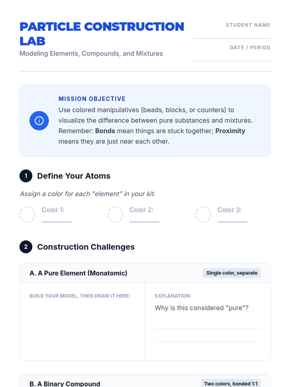A comprehensive sequence for 8th-grade students exploring the internal structure of atoms. Students move from modeling subatomic particles to calculating atomic mass, constructing Bohr models, and investigating isotopes, culminating in the ability to decode periodic table tiles.