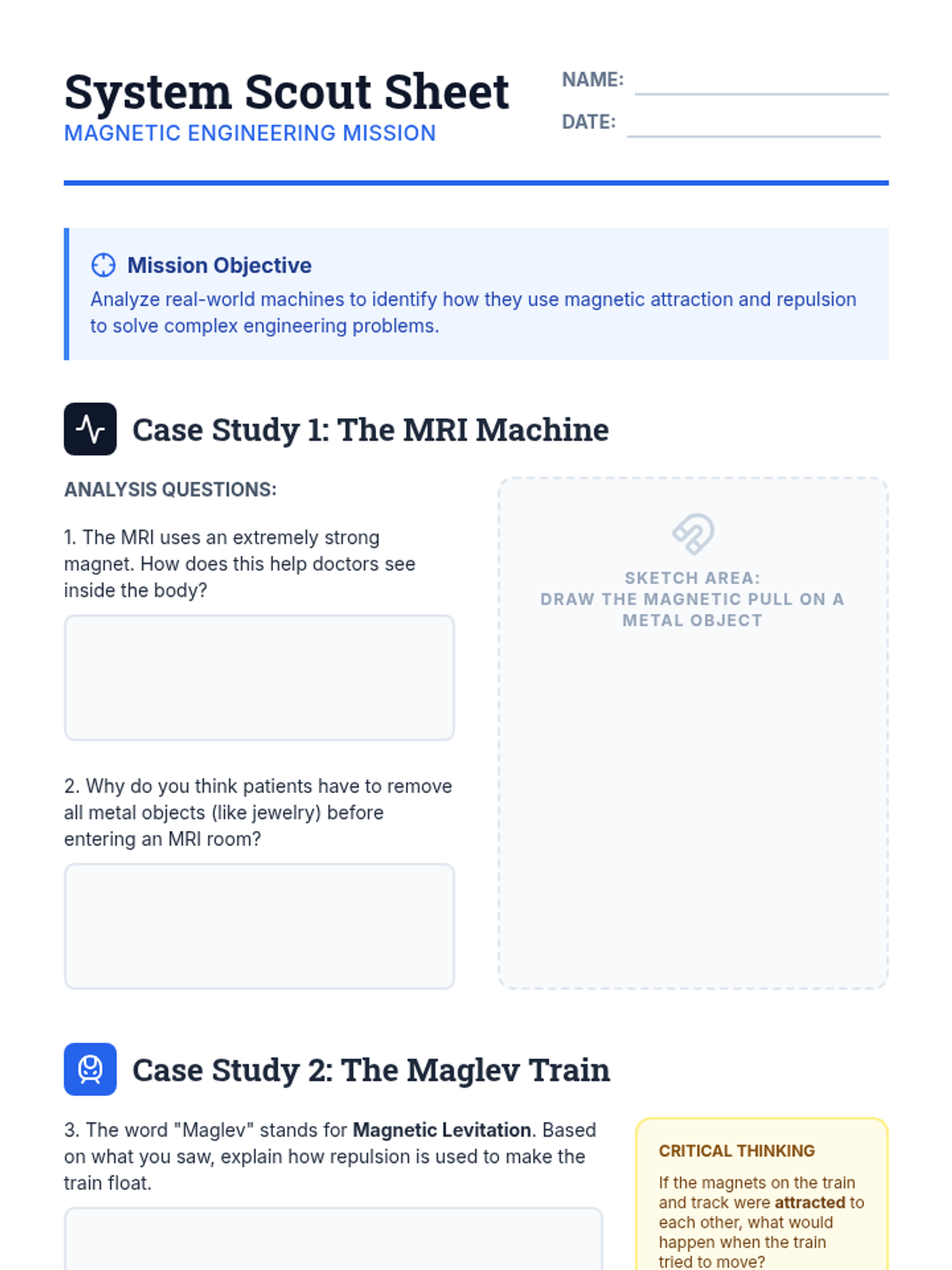 This project-based sequence explores magnetic systems through the lens of engineering. Students apply their knowledge of attraction and repulsion to solve friction problems, culminating in the design and prototyping of a Maglev vehicle.