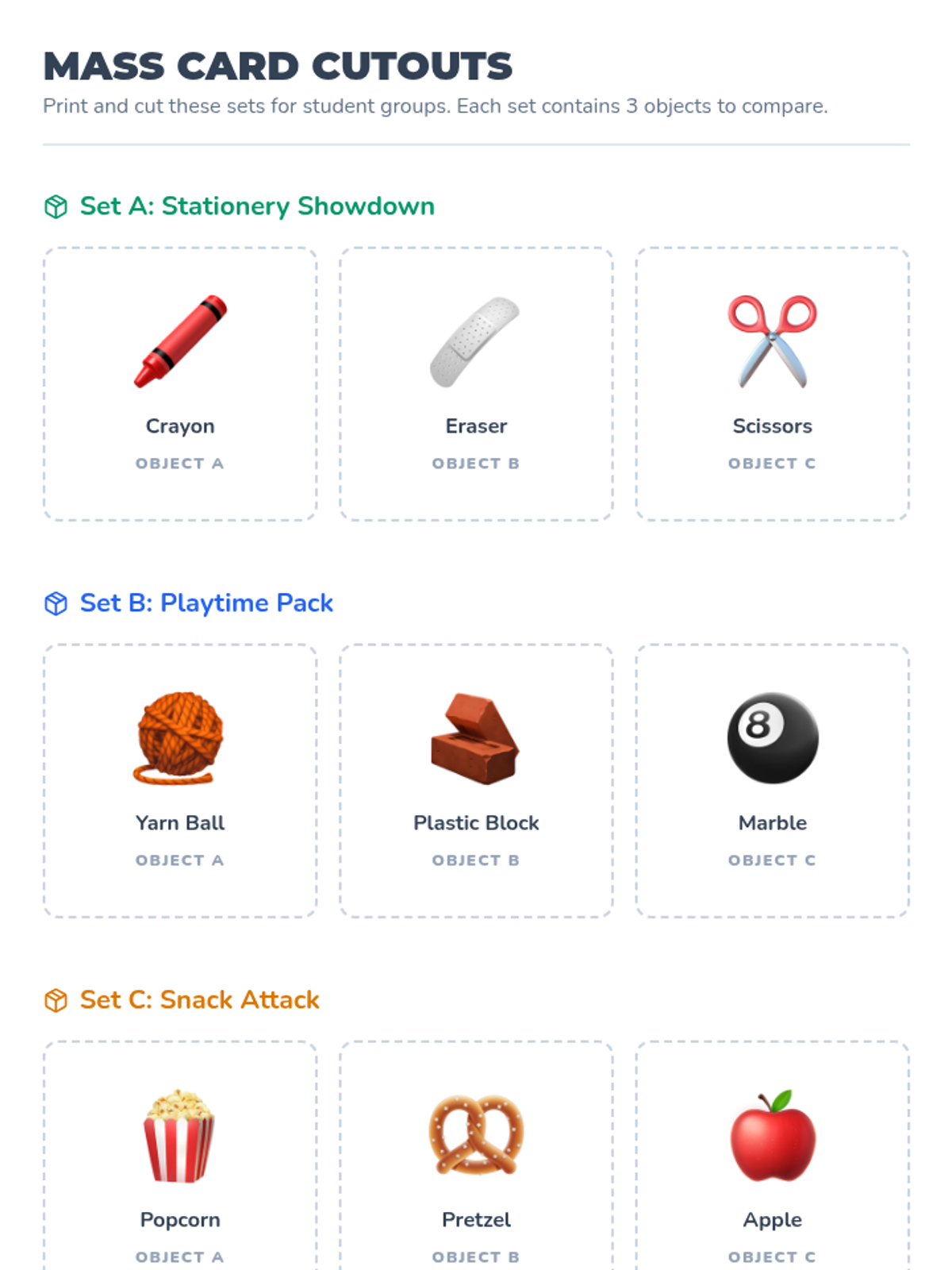 A Kindergarten sequence introducing measurement concepts through attribute sorting, temperature exploration, tool selection, time perception, and hands-on station rotations. Students learn to use rulers, scales, thermometers, and timers to quantify the world around them.
