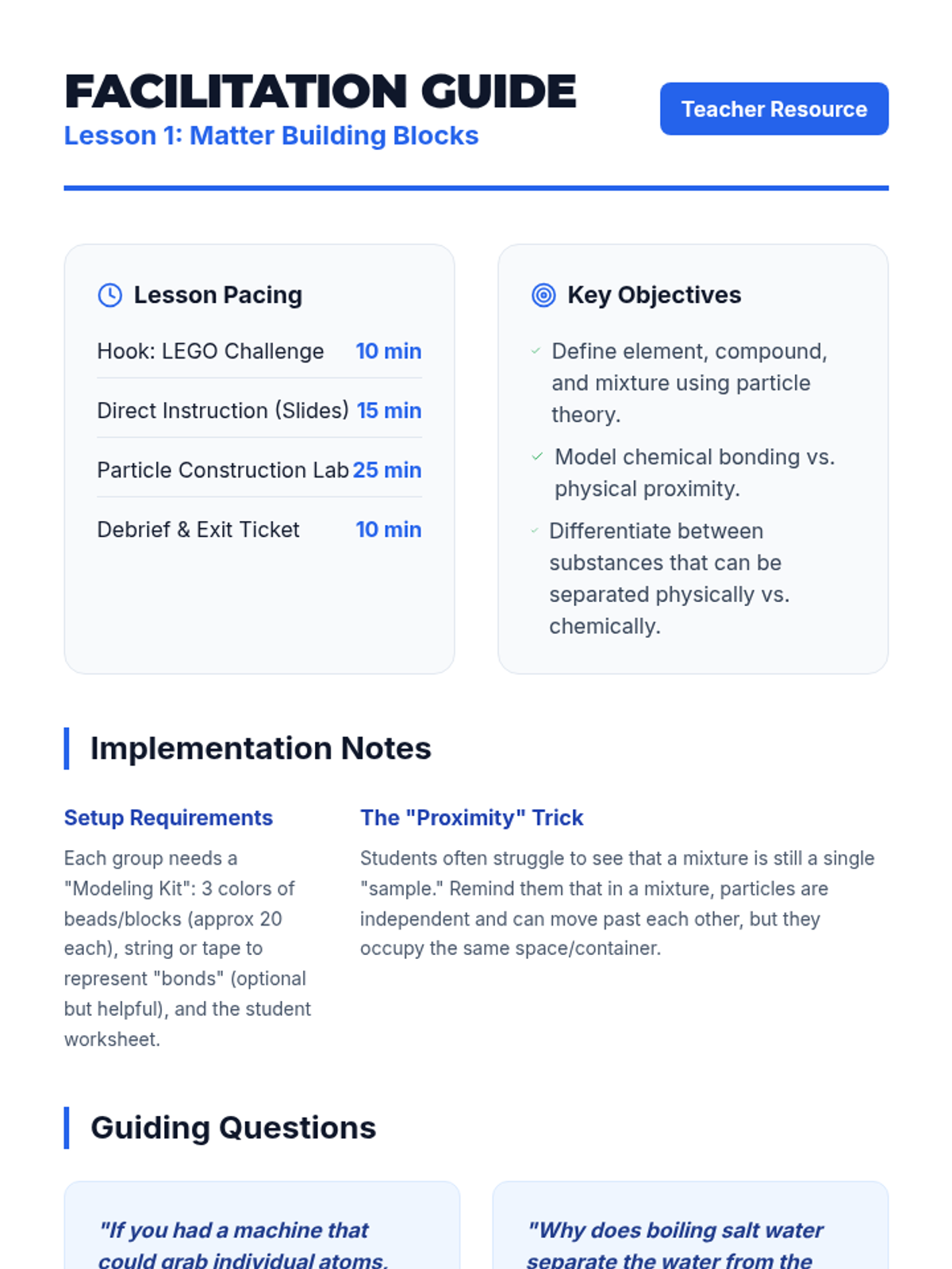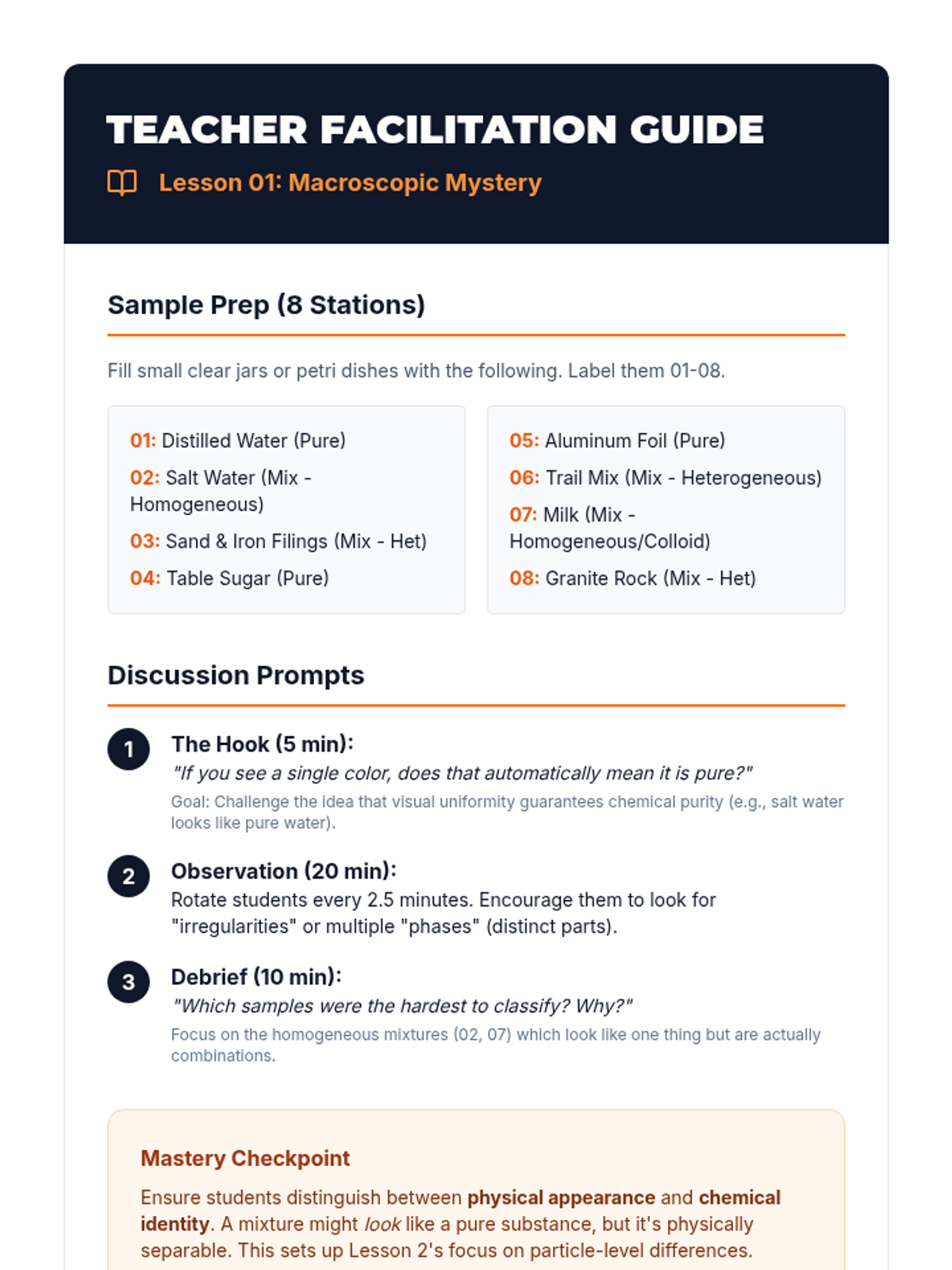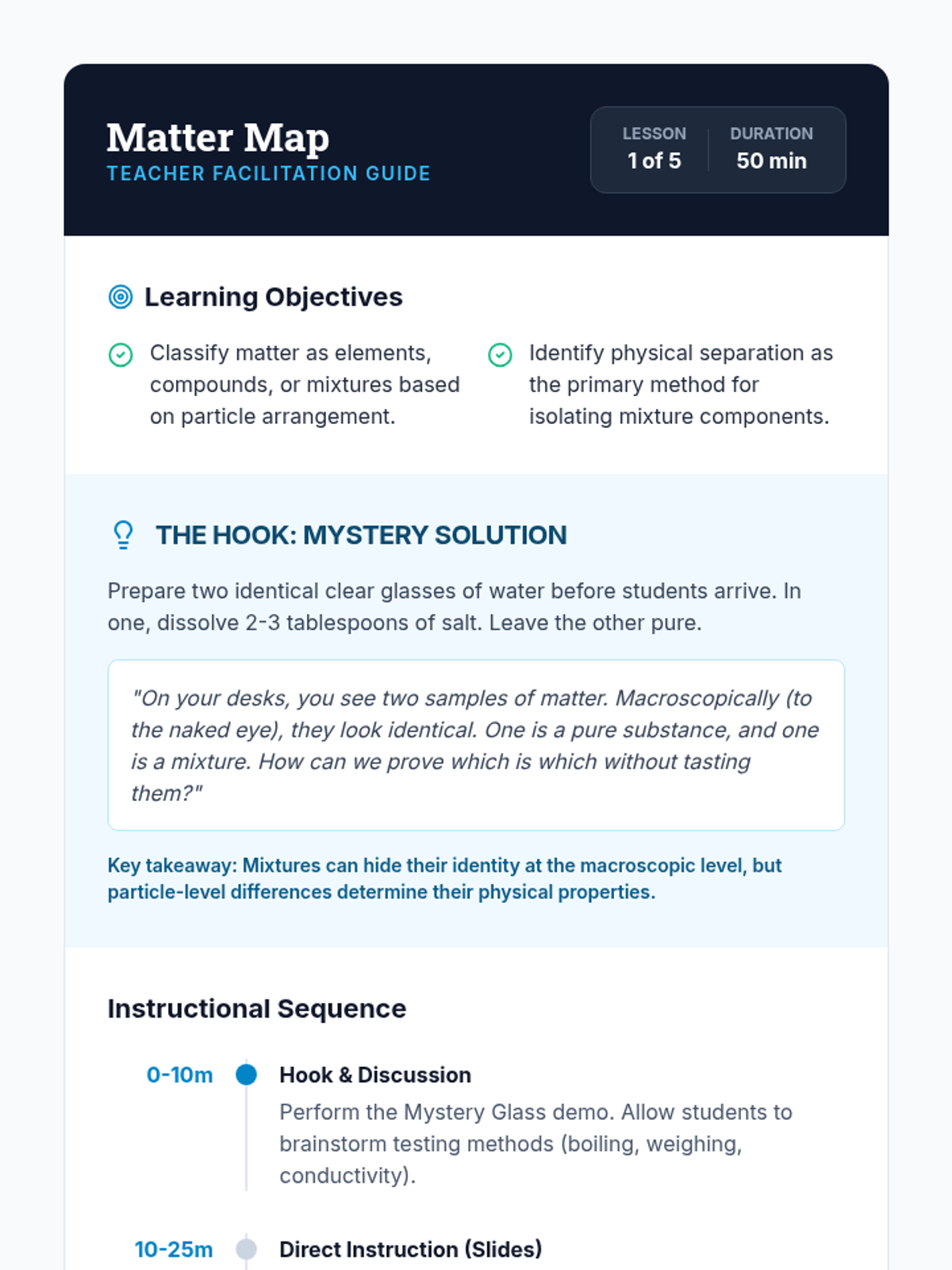 This 8th-grade sequence explores the particle-level interactions within mixtures, focusing on modeling the differences between pure substances and mixtures. Students use physical manipulatives, digital simulations, and classification workshops to master the concepts of concentration, saturation, and the microscopic structure of heterogeneous and homogeneous matter.