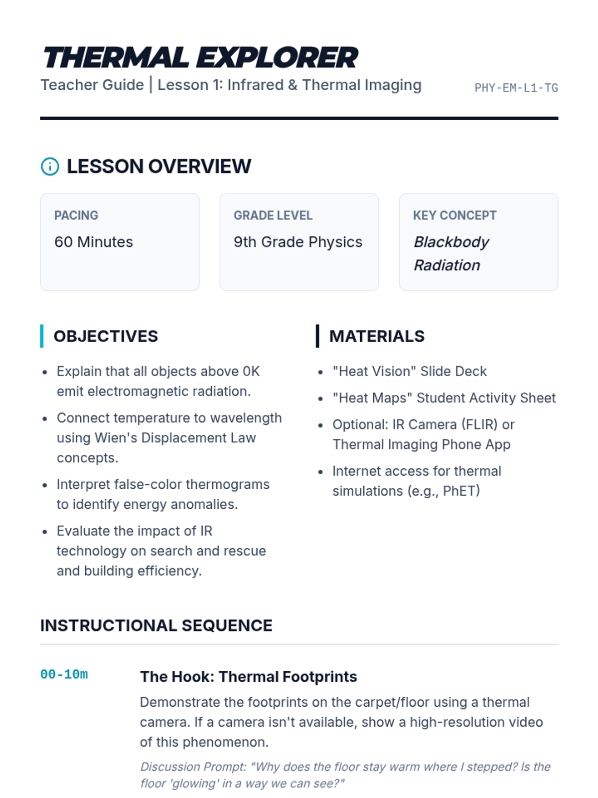 This 9th-grade physics sequence explores the practical and emerging applications of electromagnetic waves. Students investigate infrared thermography, the principles of fiber optics via total internal reflection, satellite remote sensing for global monitoring, and future communication technologies like Li-Fi, culminating in a creative engineering proposal.