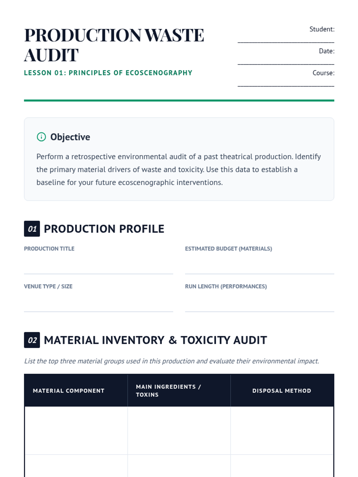 A graduate-level exploration of sustainable set design, focusing on ecoscenography, material science, modular engineering, and digital fabrication to move the theater industry toward a circular economy.