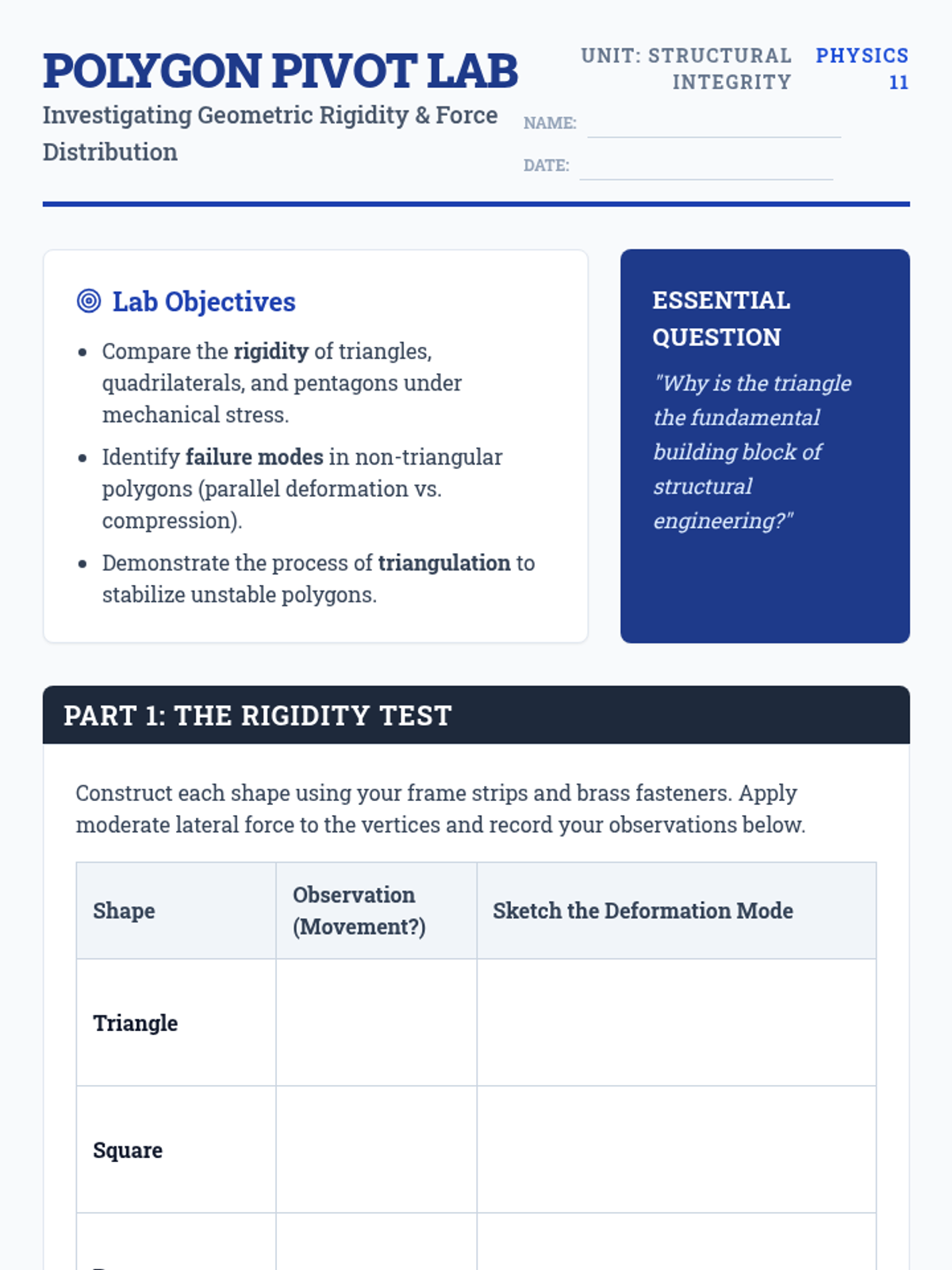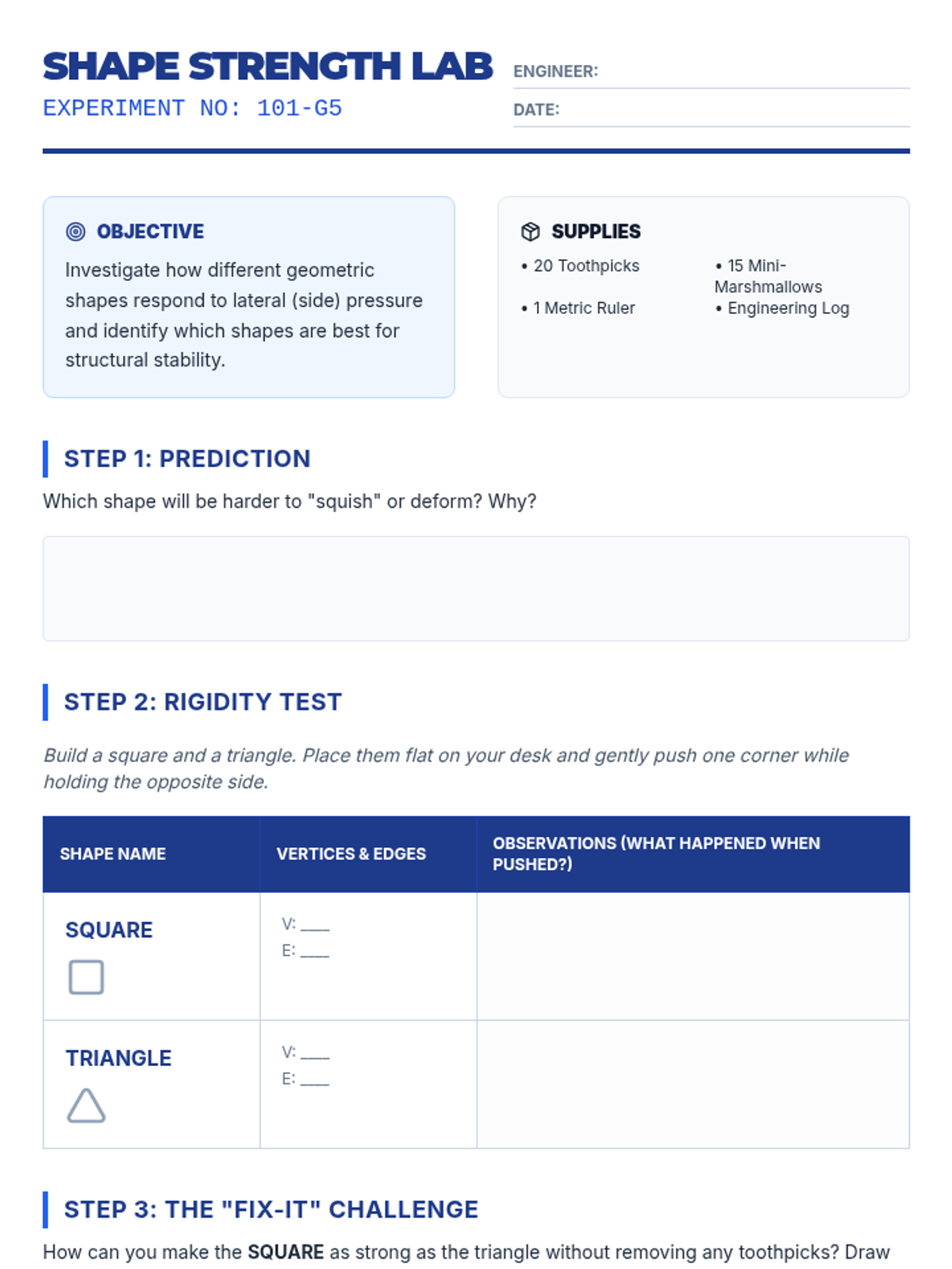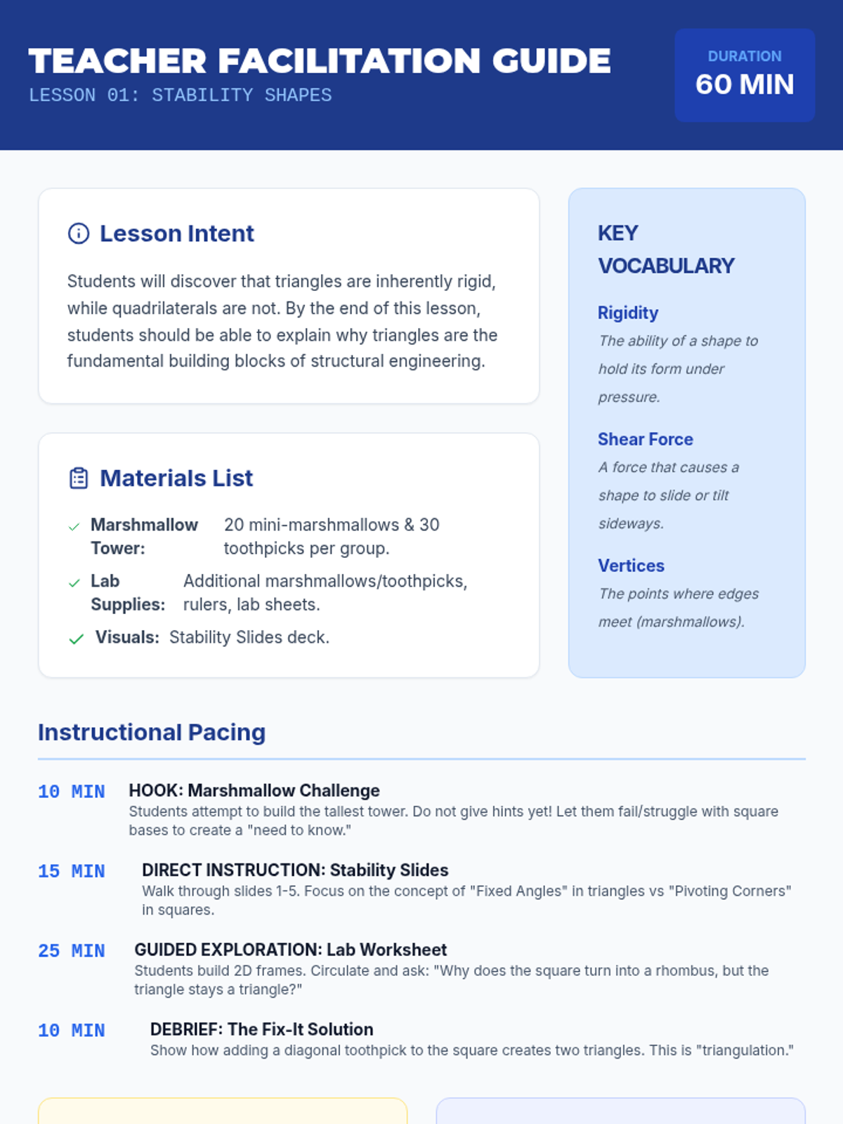 Students explore how geometric shapes like triangles and squares contribute to structural stability through hands-on building and testing. They apply their knowledge of vertices and sides to engineering challenges, concluding with a design review of their own stable structures.