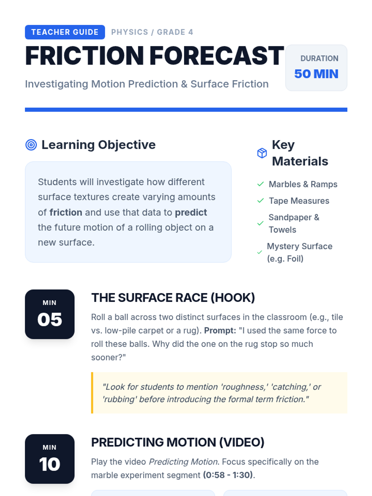 A short sequence exploring the physics of motion, specifically focusing on how forces like friction and gravity allow us to predict an object's behavior. Students move from intuitive observation to data-driven calculation and scientific investigation.