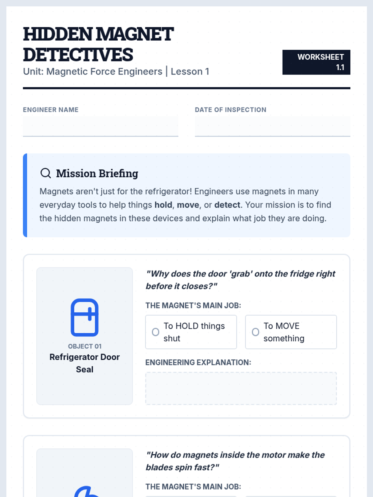 A project-based sequence for 2nd graders to apply magnetism concepts to engineering. Students analyze real-world magnetic objects, brainstorm solutions to common problems, and prototype their own magnetic inventions.