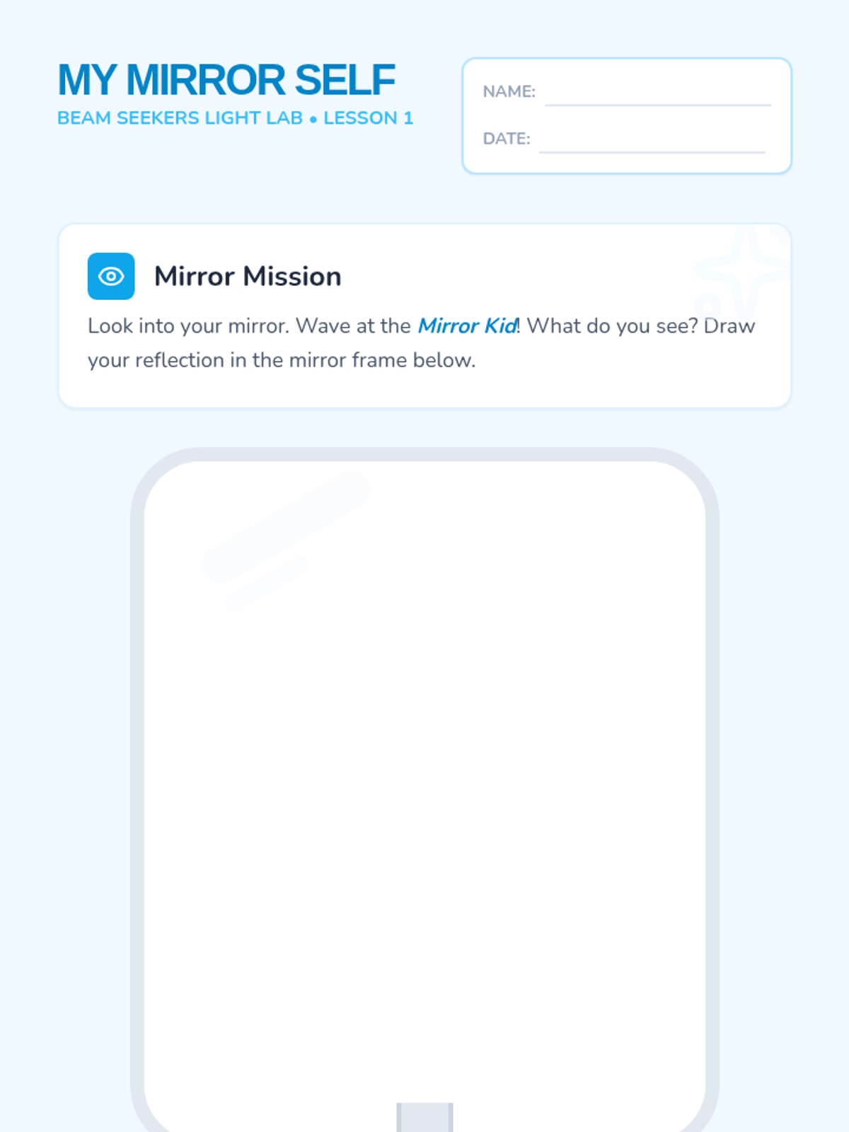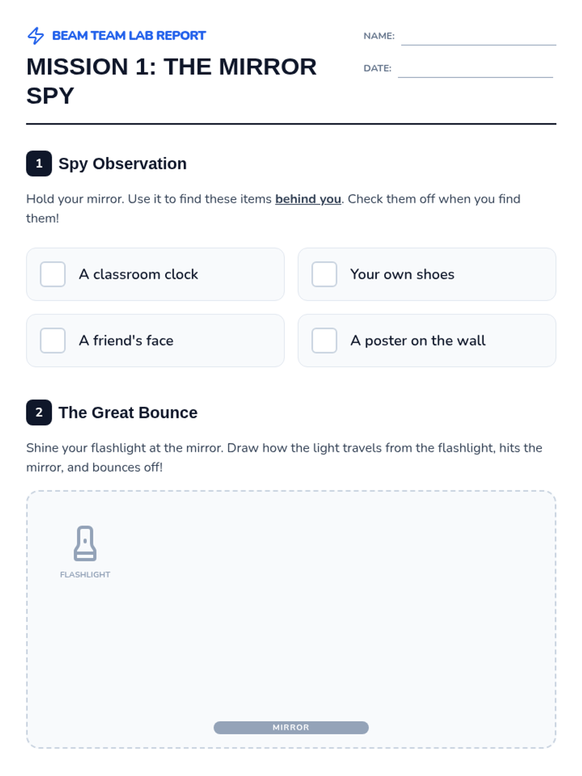 A Kindergarten science sequence exploring the physics of light through reflection. Students engage in hands-on activities with mirrors and flashlights to understand how light bounces, travels in straight lines, and creates symmetry.