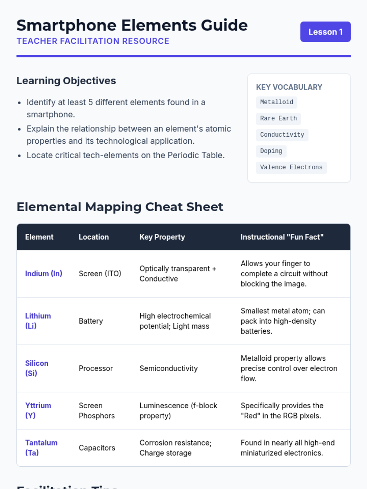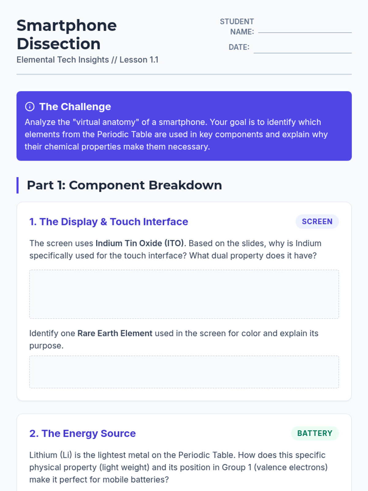 This sequence explores the practical application of the Periodic Table in modern technology, from smartphones to medical imaging. Students investigate the atomic properties of specific groups (Rare Earths, Metalloids, Isotopes) and analyze the geopolitical and ethical implications of our reliance on these materials.