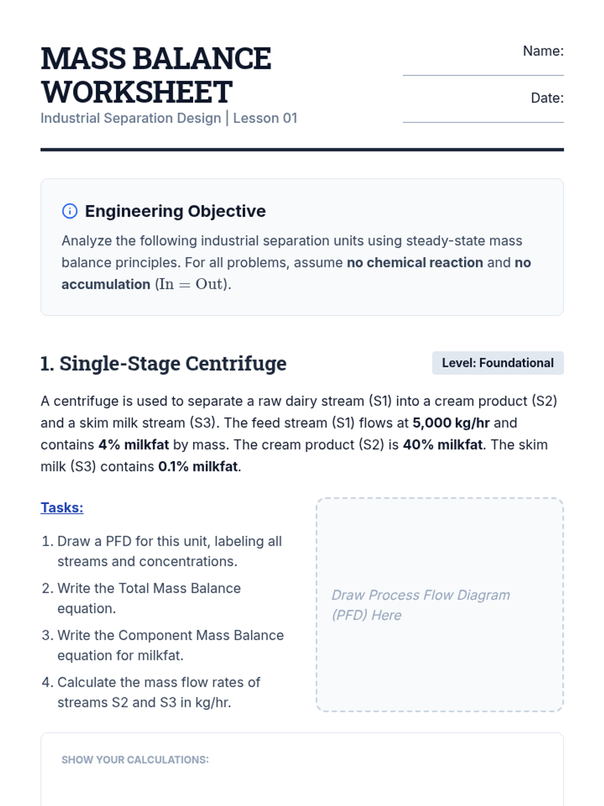 This undergraduate-level sequence explores the engineering principles of industrial separation processes. Students progress from fundamental mass balance and process flow diagrams to specialized technologies like membrane filtration, centrifugation, and large-scale evaporation, culminating in an integrated plant design project.