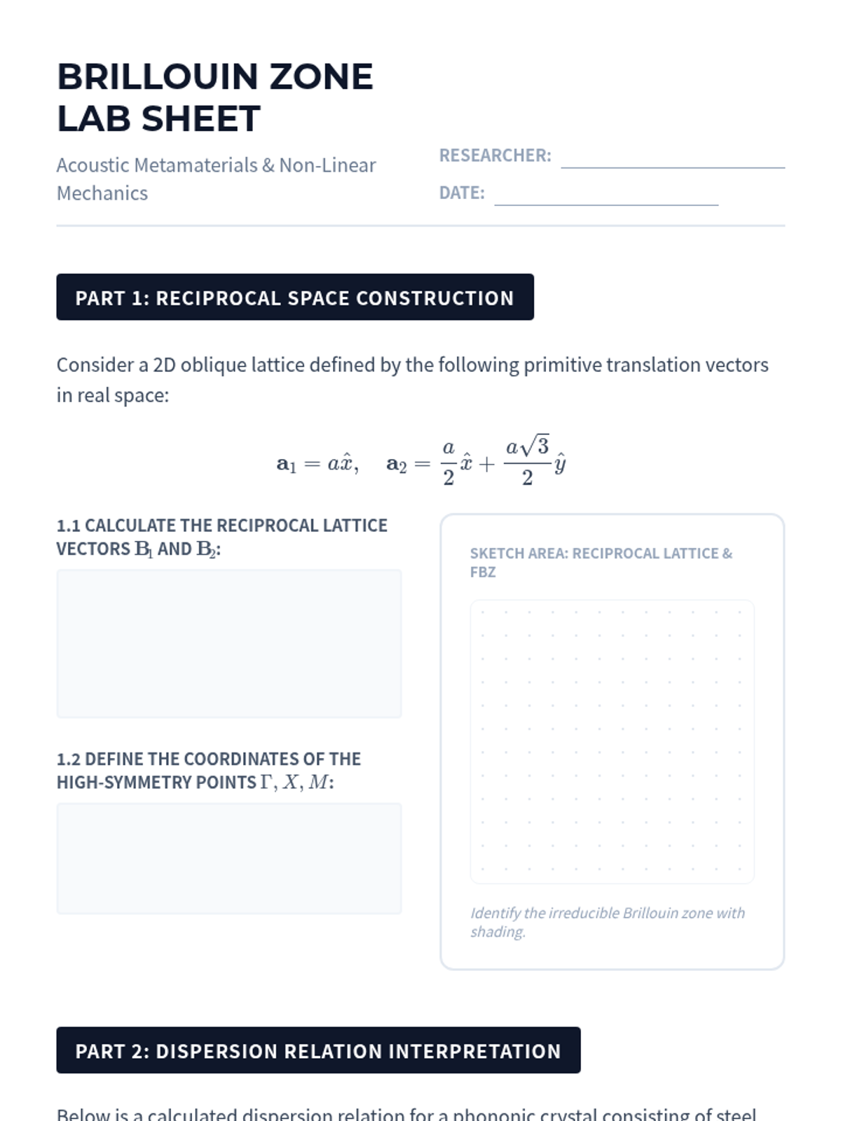 An undergraduate-level exploration of solid-state crystallography, moving from real-space lattice geometry and packing efficiency to the mathematical abstraction of reciprocal space and X-ray diffraction analysis. Students master the geometric principles that govern material properties at the atomic scale.