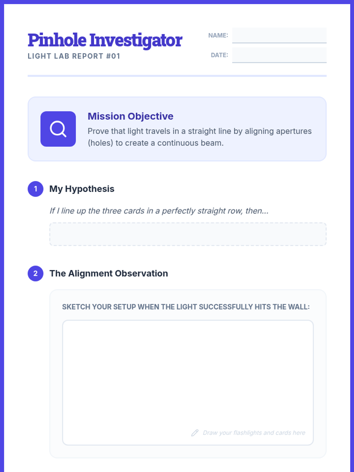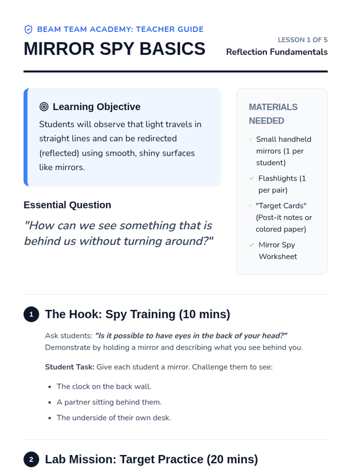 A 2nd-grade physics sequence focused on light reflection, where students act as 'Light Engineers' to manipulate beams using mirrors through gamified challenges and a final maze design project.
