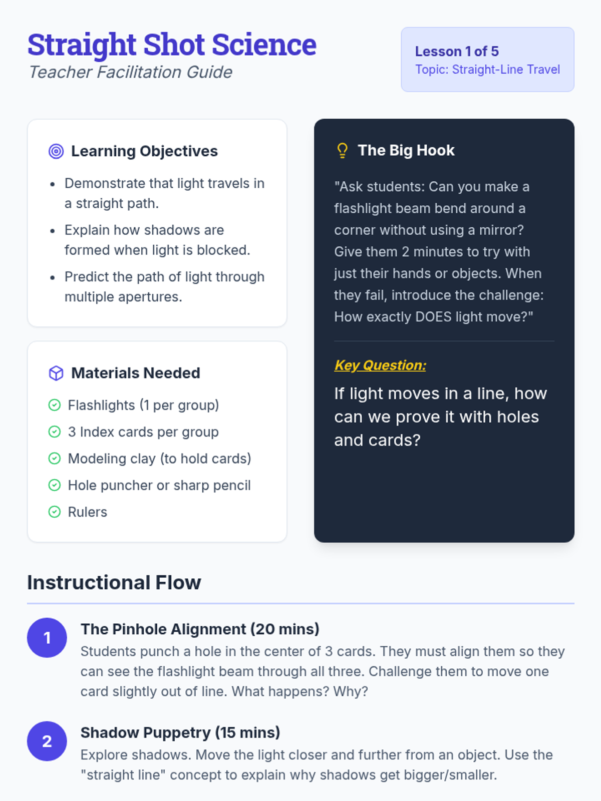 A comprehensive 4th-grade physics sequence exploring the properties of light, including straight-line travel, reflection, and material interaction through hands-on inquiry and engineering challenges.