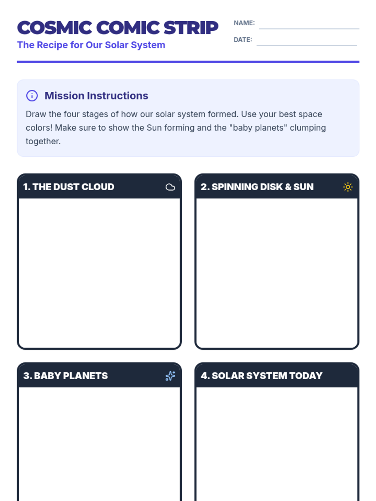 A sequence focused on understanding the origins and structure of our solar system, starting with the formation of the sun and planets from a cloud of dust and gas.