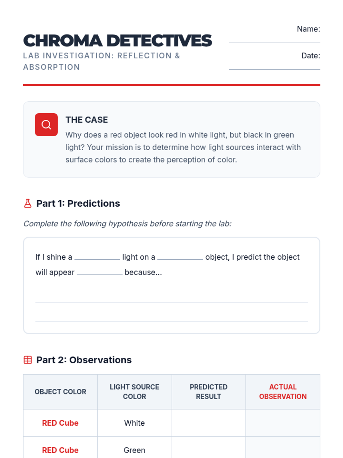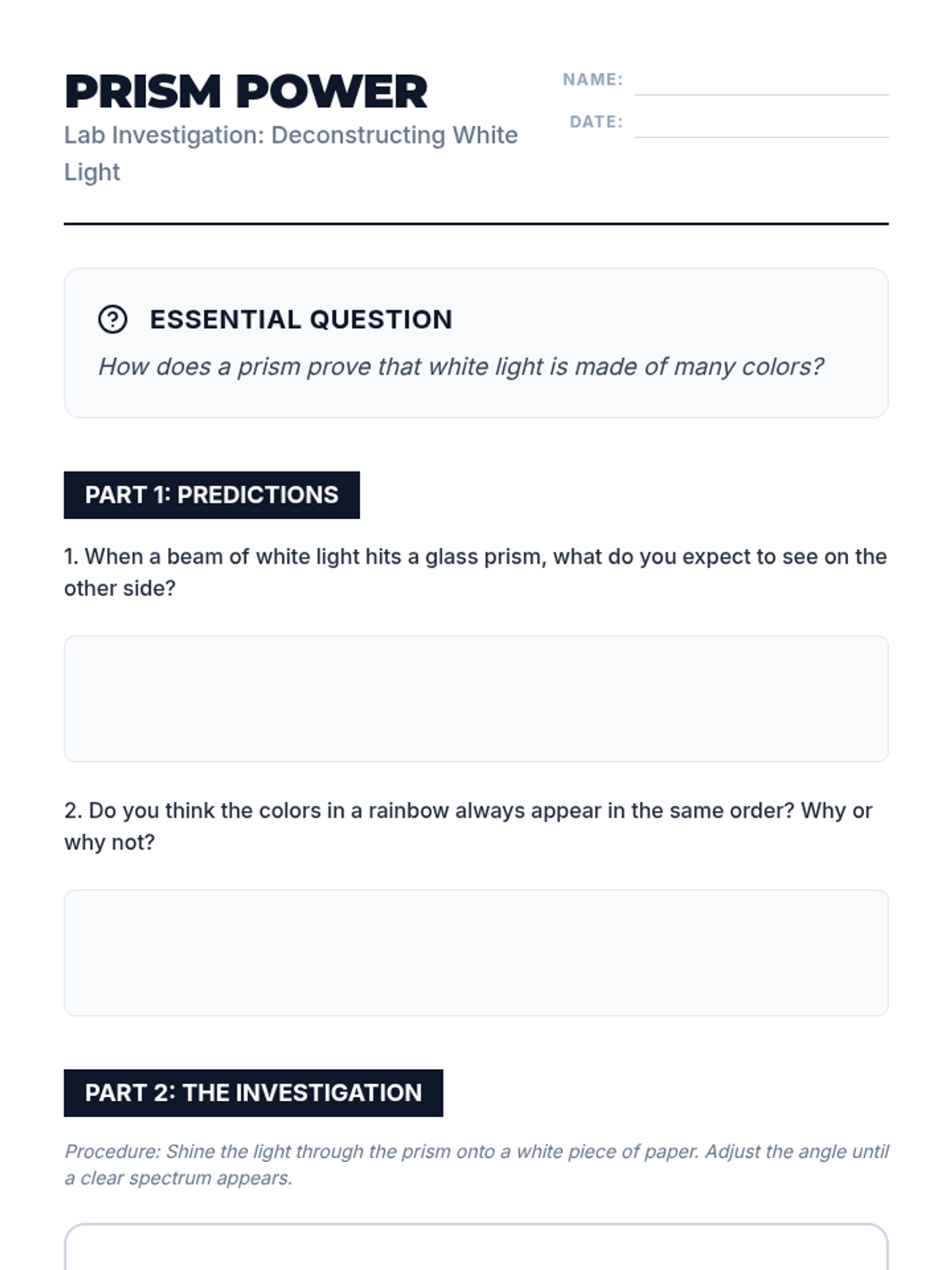 An inquiry-driven physics sequence exploring visible light, refraction, color theory, spectroscopy, and optics. Students investigate how light interacts with matter and how these interactions shape our perception of reality.