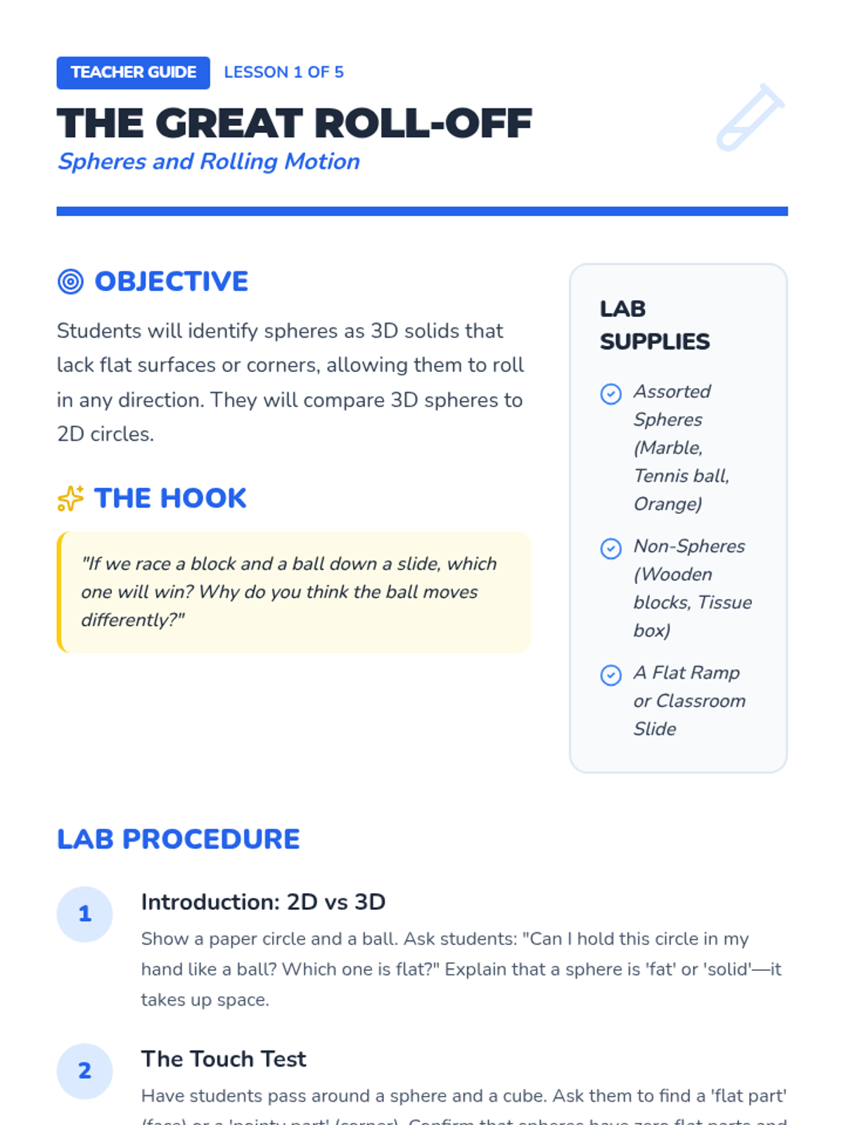 A Pre-K physics sequence exploring three-dimensional solids. Students investigate the properties of spheres, cubes, cylinders, and cones through hands-on experimentation with rolling, stacking, and sliding to understand how shape dictates movement and stability.