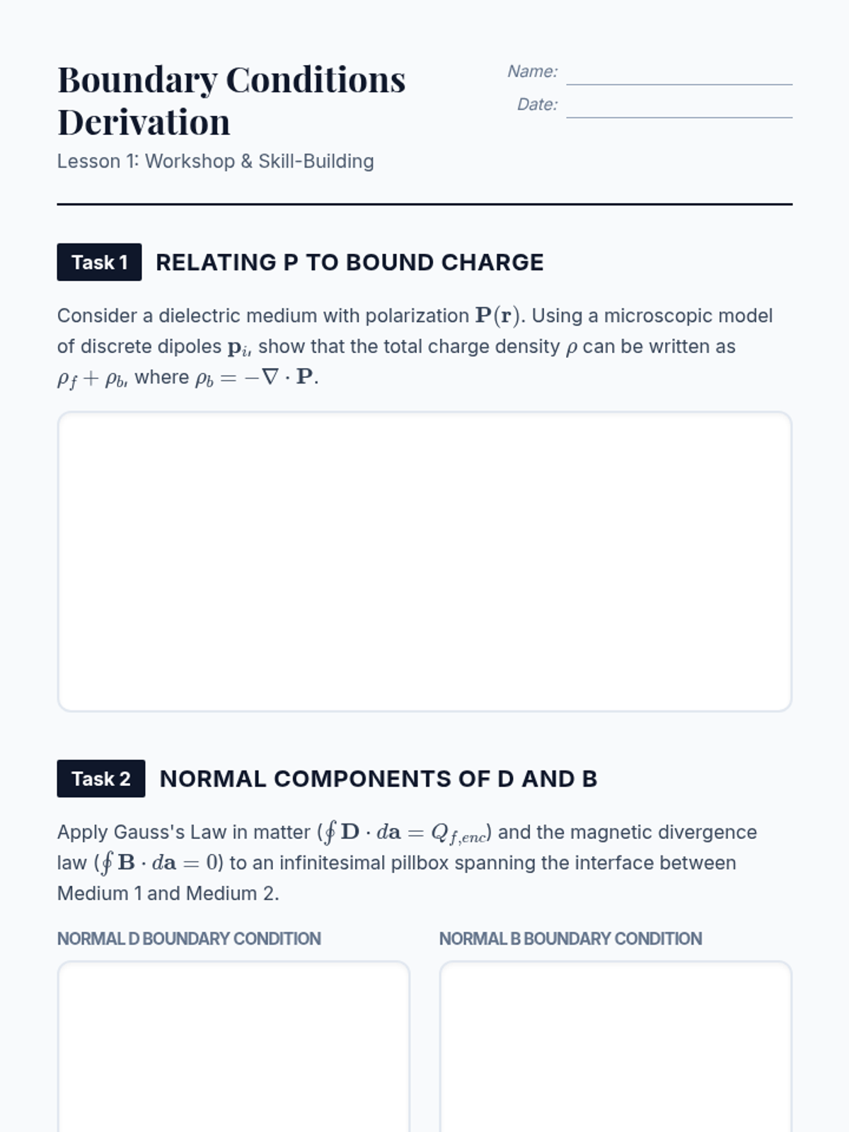 This sequence explores the behavior of electromagnetic waves at material interfaces. Students will derive boundary conditions from Maxwell's equations, apply the Fresnel equations to predict reflection and transmission, and investigate phenomena like Brewster's angle, total internal reflection, and fiber optic waveguides.