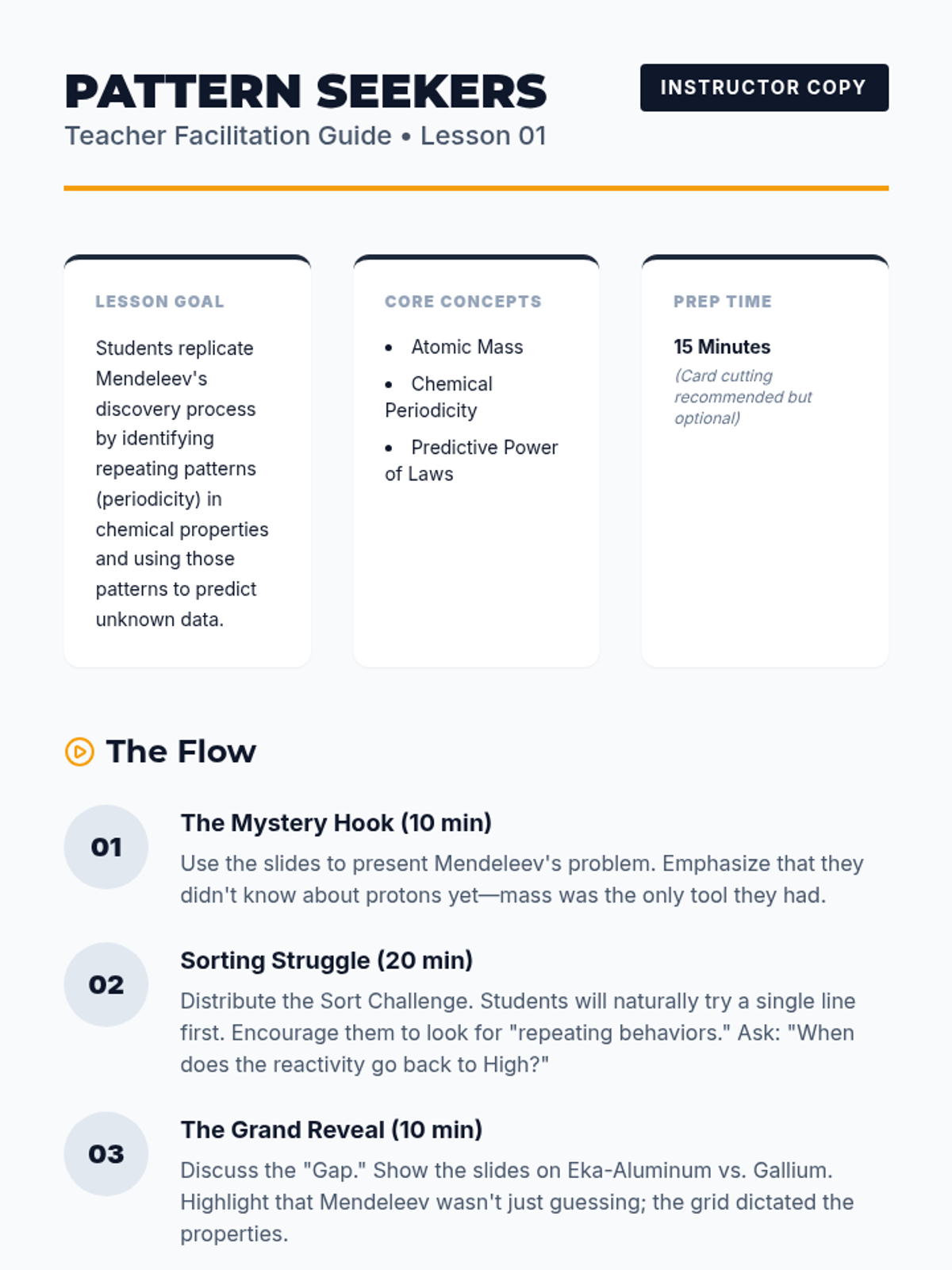 A 10th-grade physics sequence that treats the Periodic Table as a logic puzzle. Students reconstruct the table's history, moving from atomic mass patterns to the modern atomic number organization through inquiry and prediction.