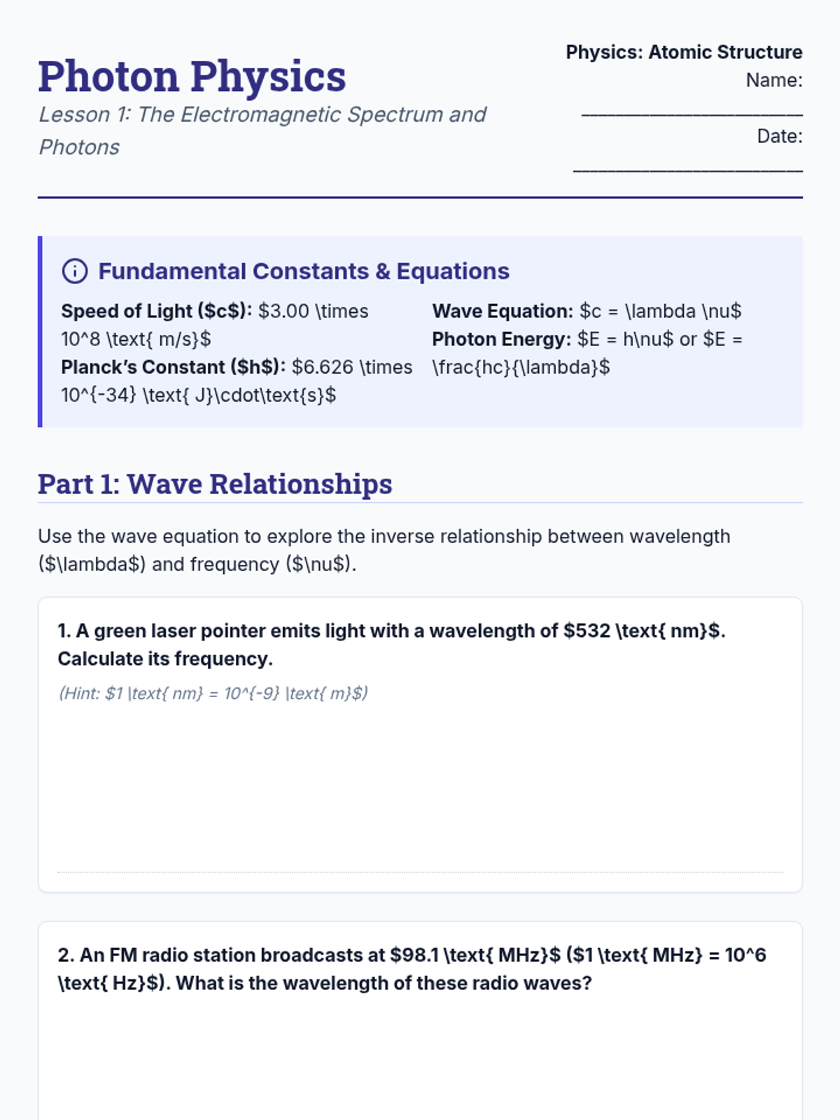 This sequence connects atomic structure to observable light phenomena. Students explore wave-particle duality, energy quantization, and spectral fingerprints to understand how spectroscopy reveals the internal architecture of elements and the composition of the universe.