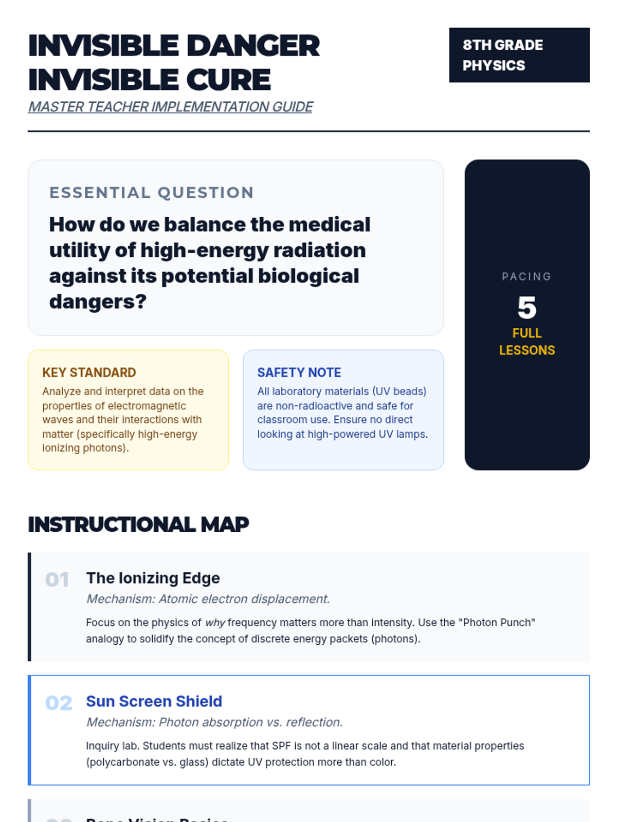 A 9th-grade physics sequence exploring the ionizing portion of the electromagnetic spectrum, covering UV, X-rays, and Gamma rays, focusing on biological impacts, medical applications, and safety protocols.