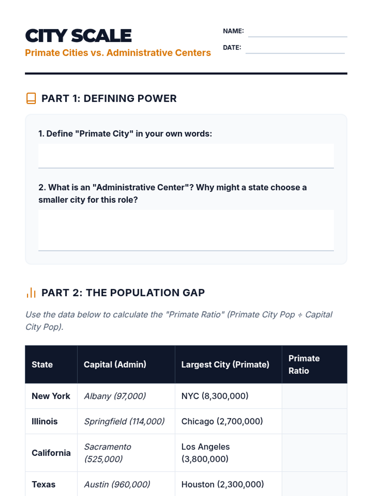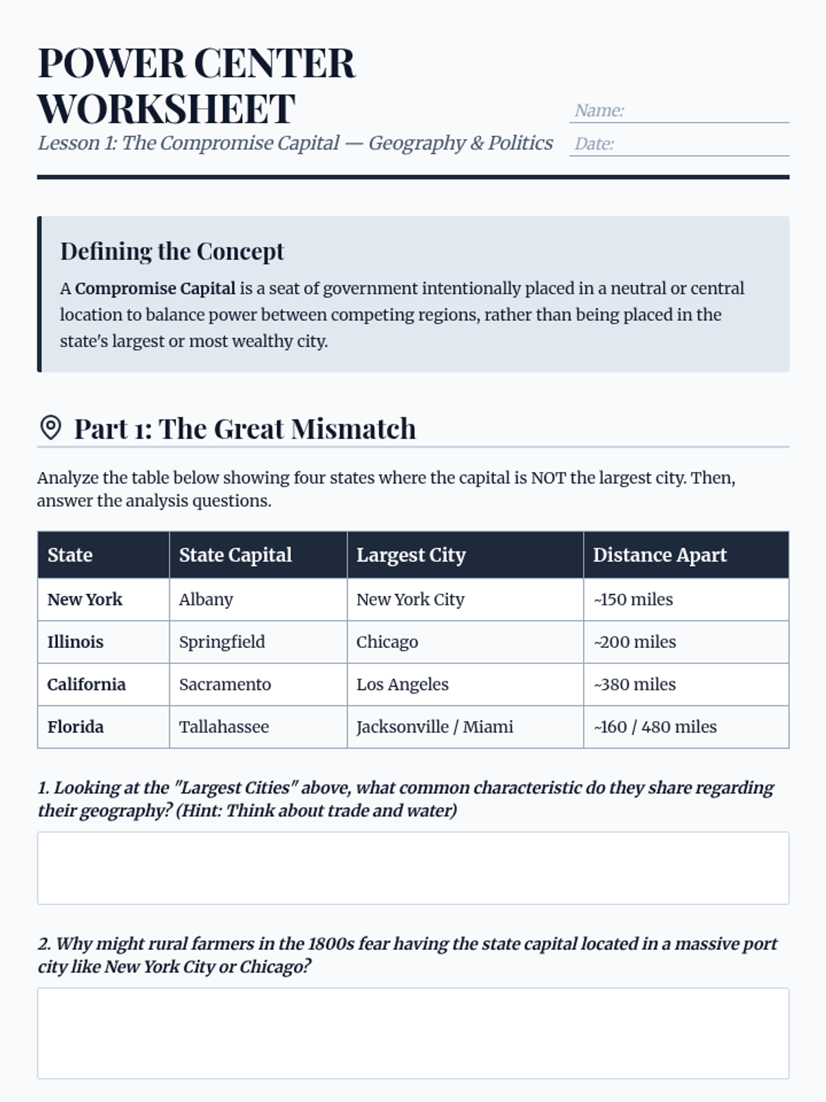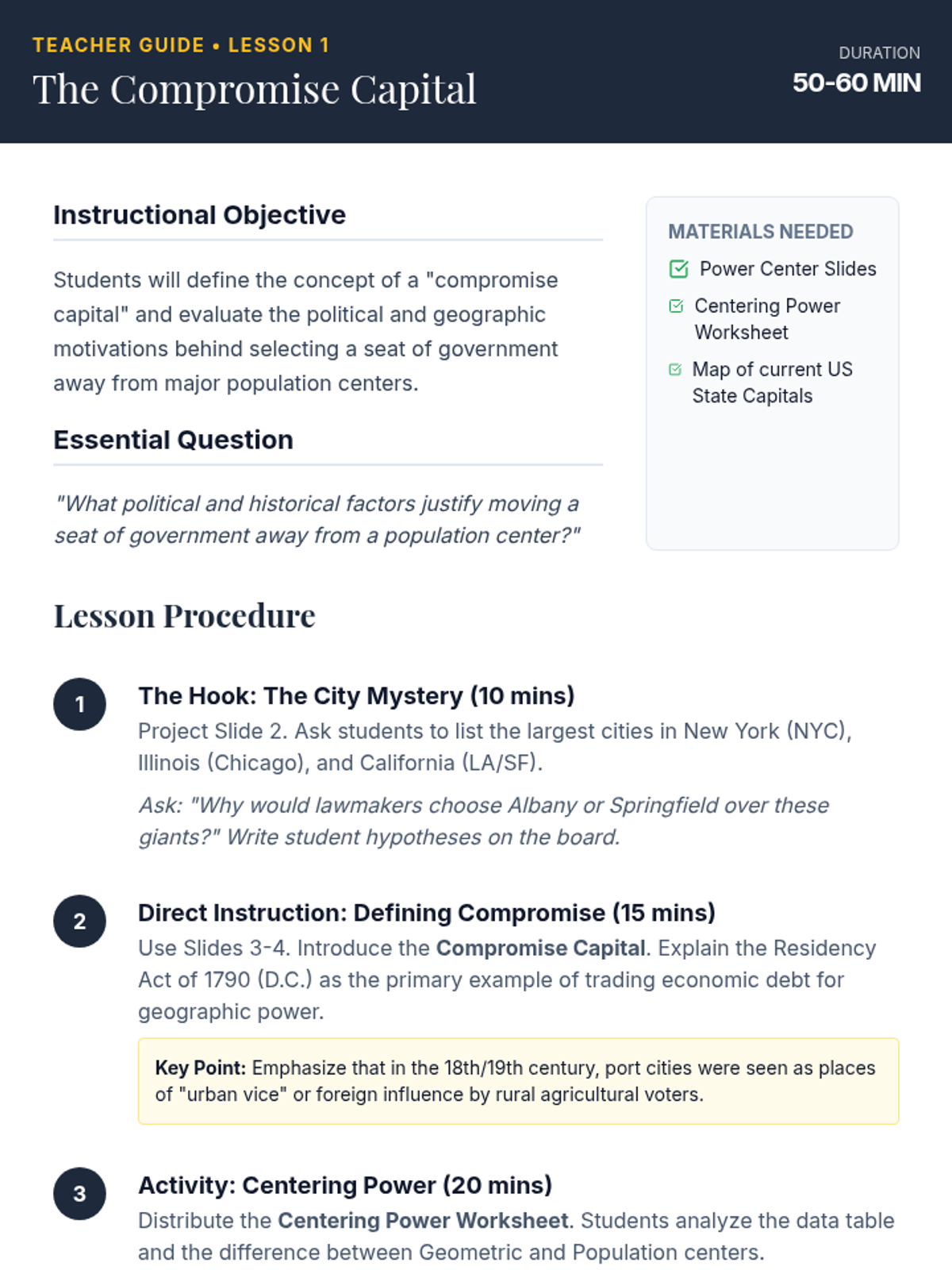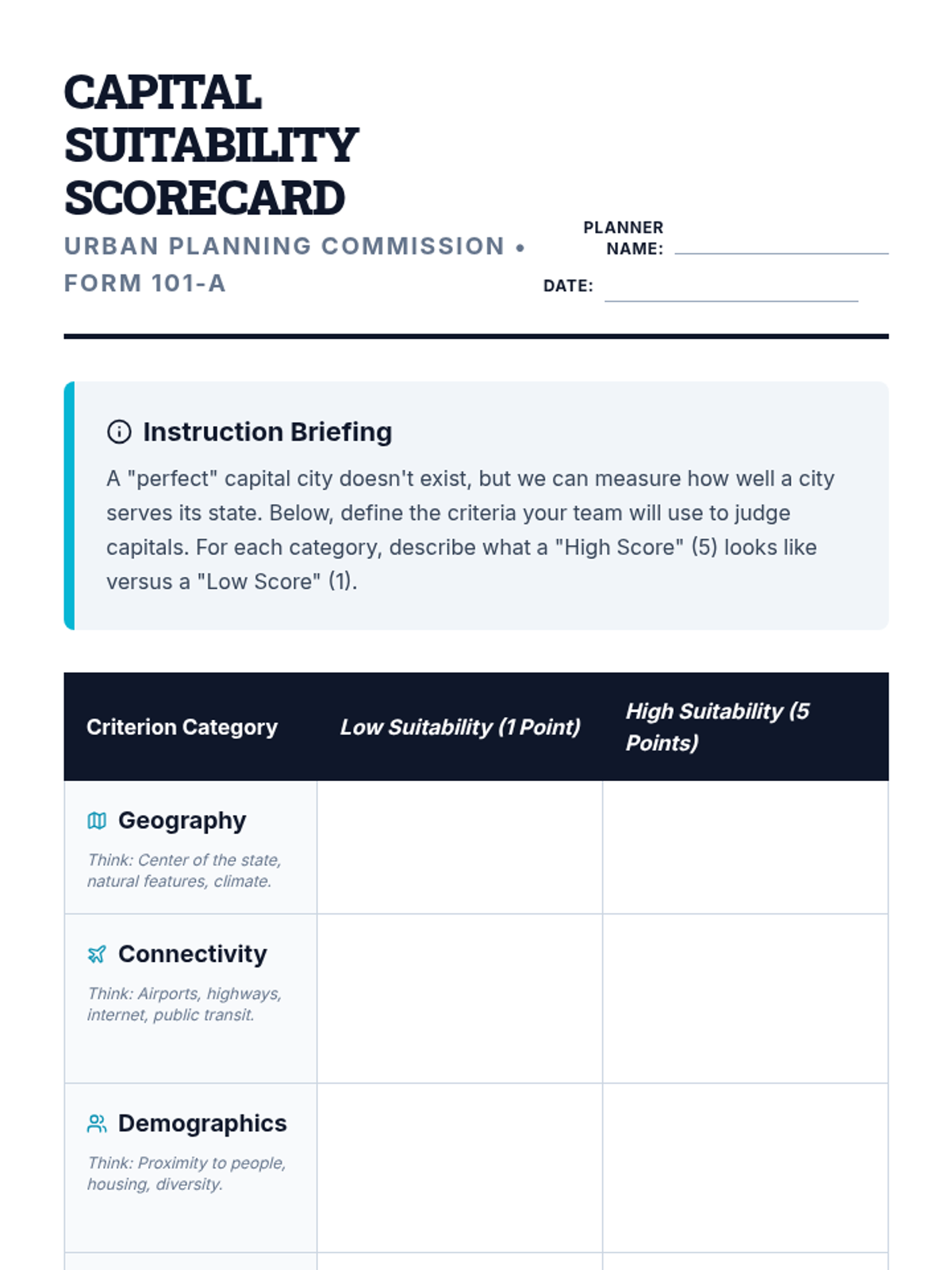 This sequence explores the functional, geographic, and symbolic roles of state capital cities. Students analyze historical placement patterns, simulate the legislative process, and design a modern capital city based on contemporary demographic and infrastructure needs.