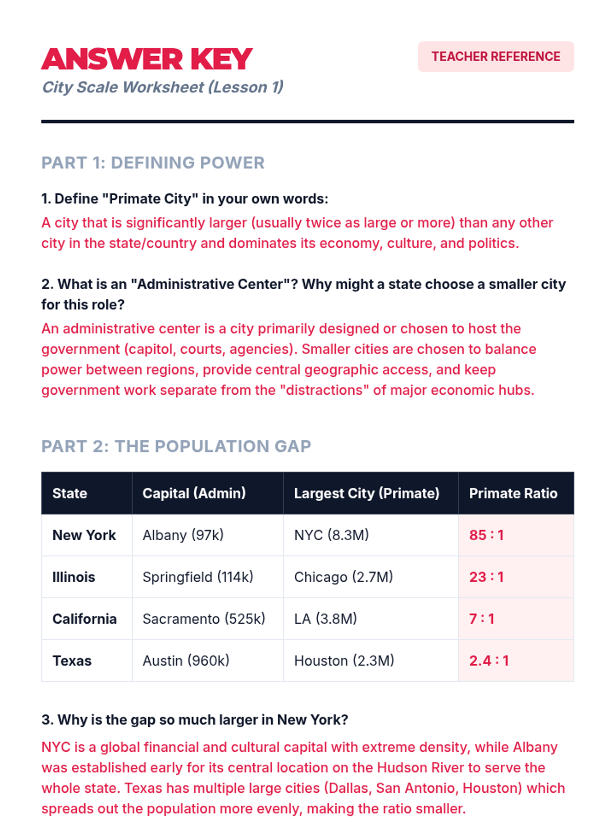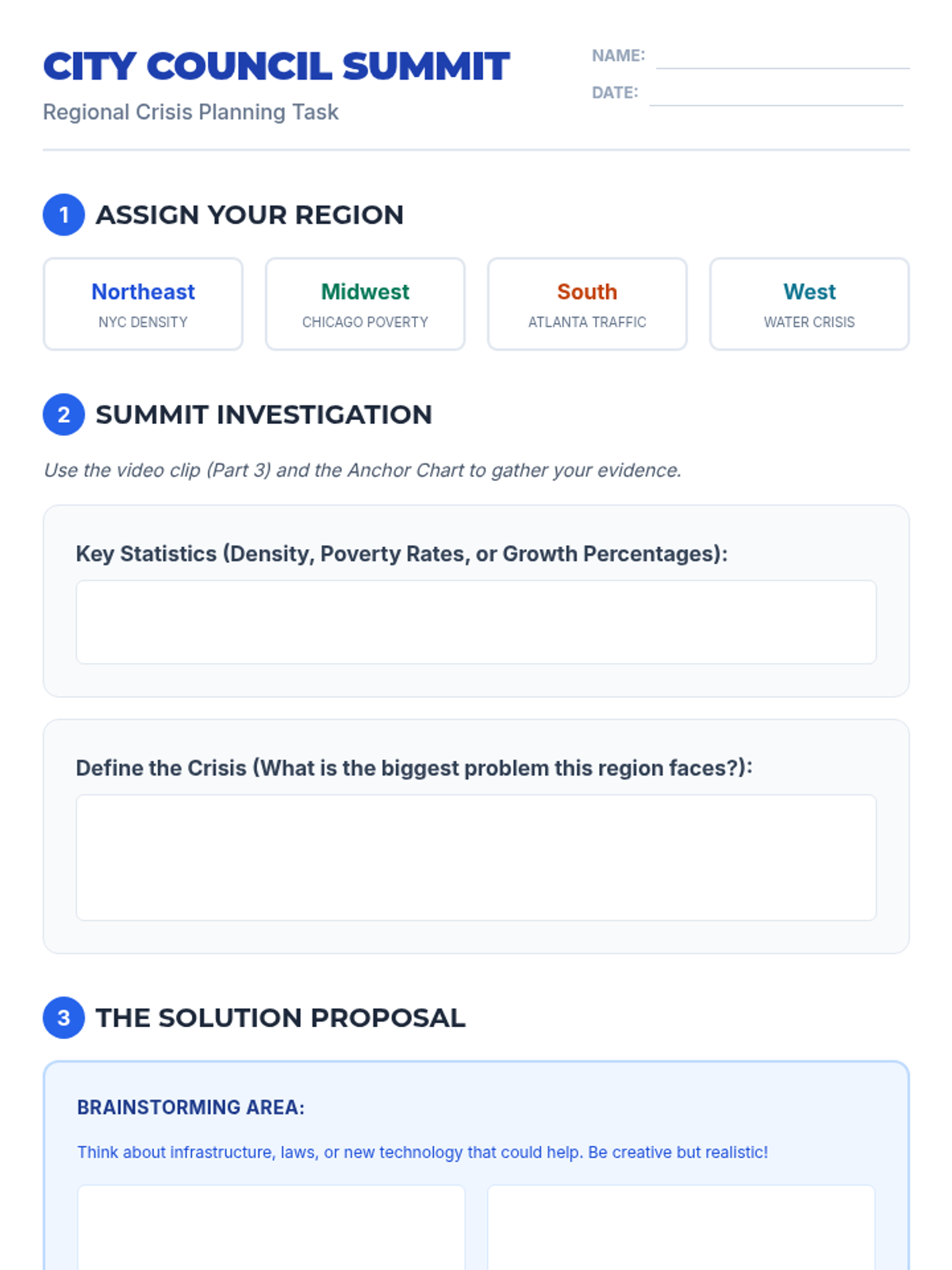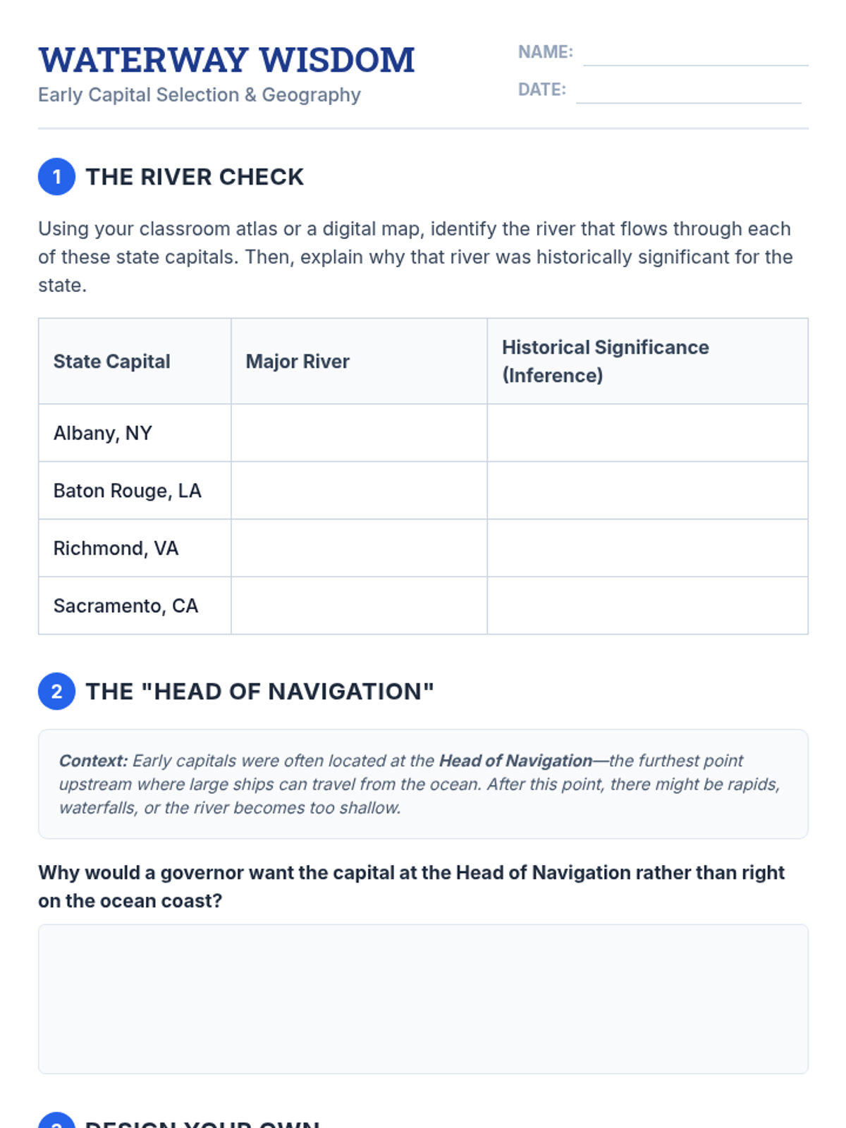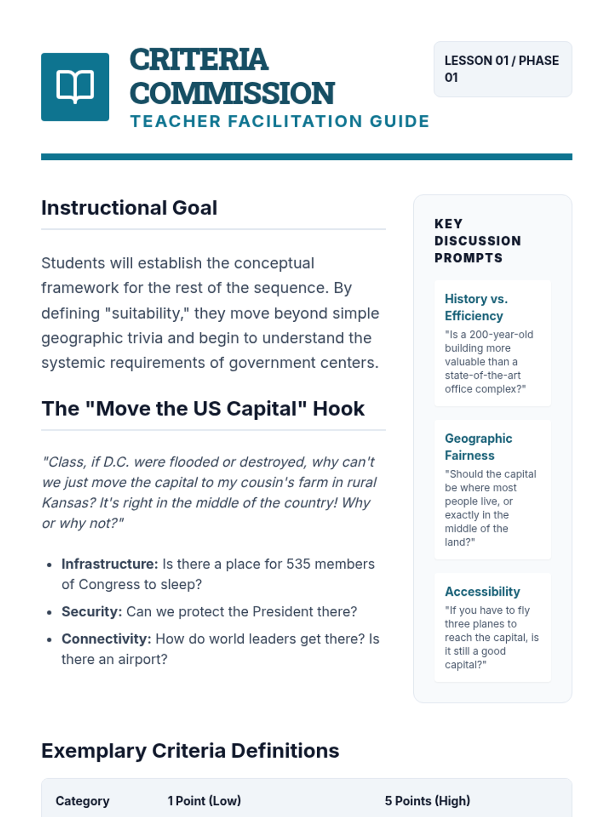 This sequence explores the functional, geographic, and symbolic roles of state capital cities. Students analyze historical placement patterns, simulate the legislative process, and design a modern capital city based on contemporary demographic and infrastructure needs.