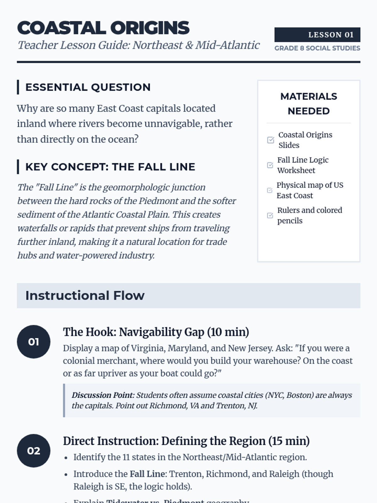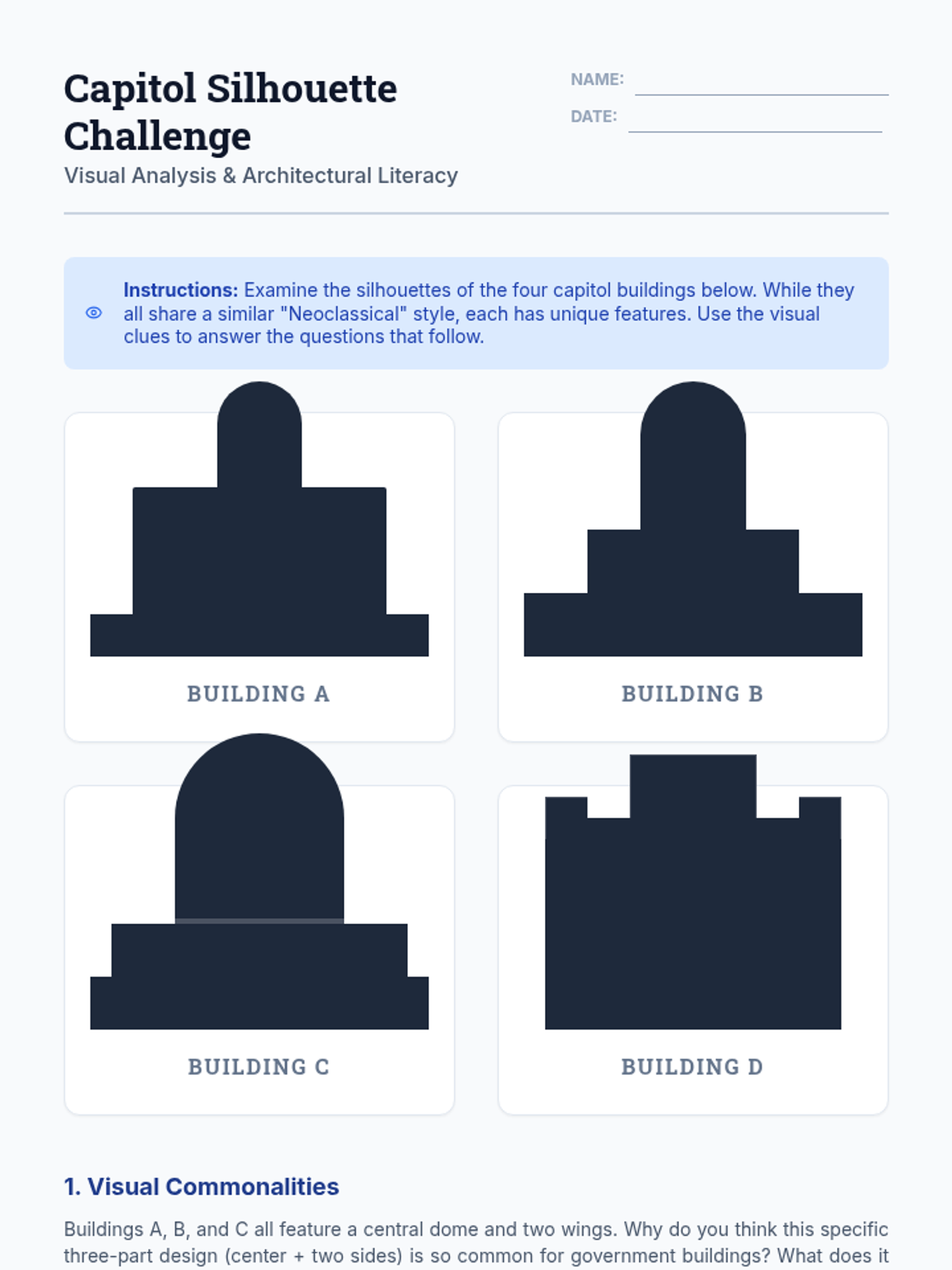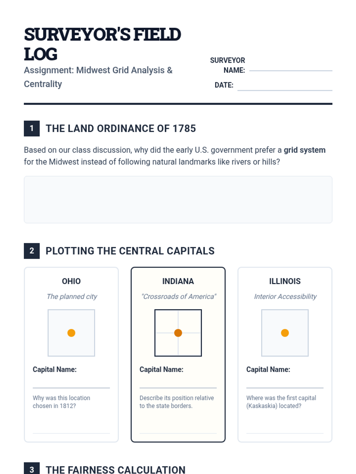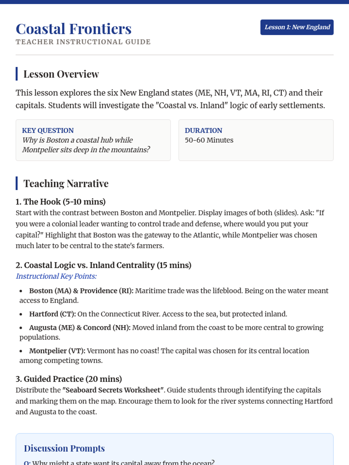 This sequence explores the functional, geographic, and symbolic roles of state capital cities. Students analyze historical placement patterns, simulate the legislative process, and design a modern capital city based on contemporary demographic and infrastructure needs.